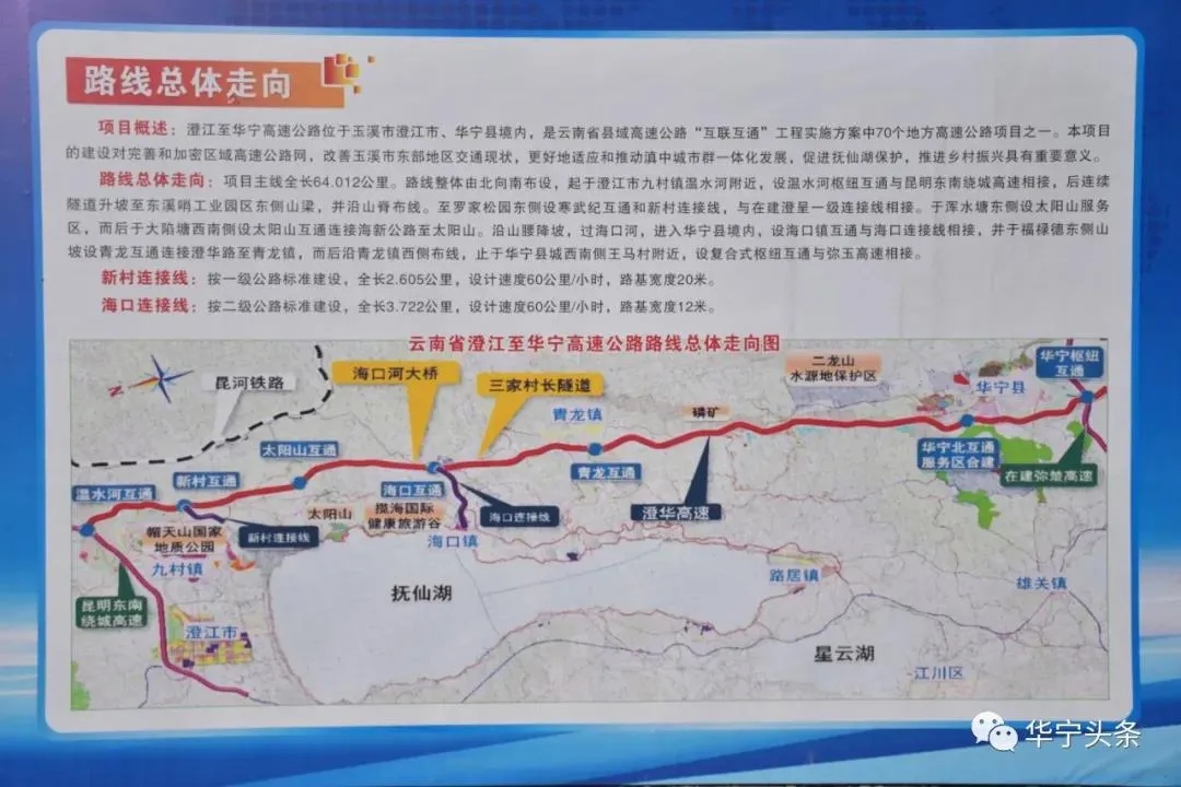 澄江至华宁高速公路是云南省县域高速公路“互联互通”工程之一,项目起于澄江市九村镇温水河,接昆明东南绕城高速,经澄江市东溪哨工业园区、新村、石门后跨海口河进入华宁县,经华宁县三家村、落梅、老李箐、煤炭窝、青龙潭,止于华宁县城西南侧王马村附近,连接弥玉高速公路。