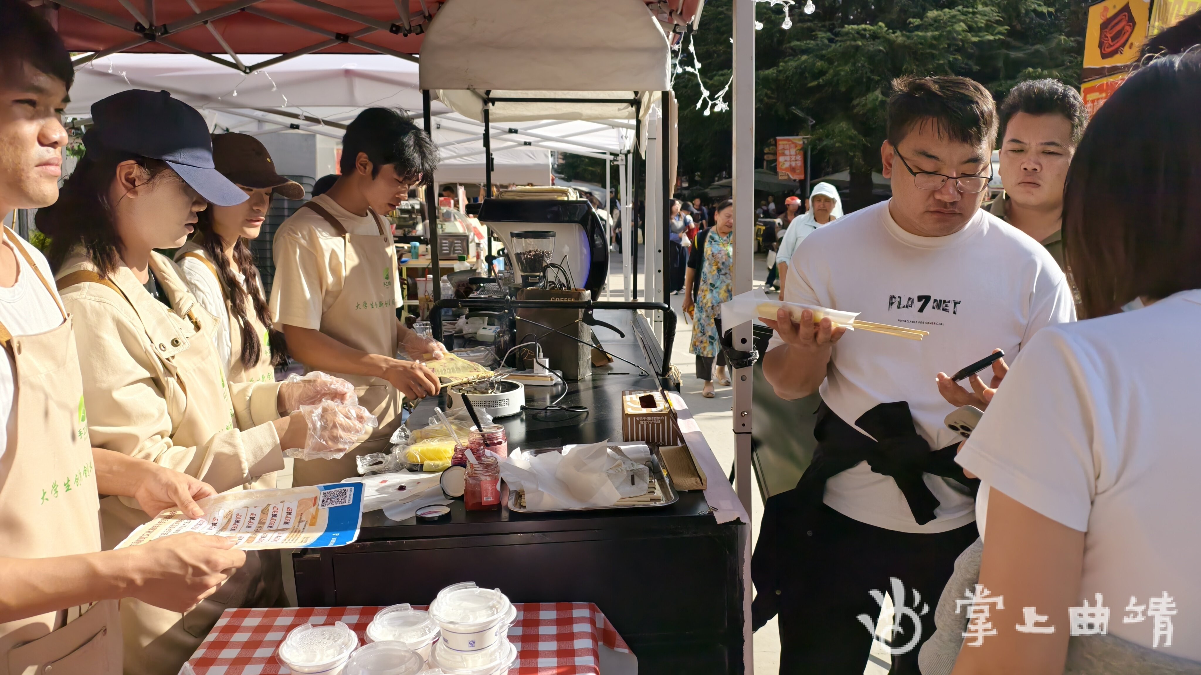 30余名来自绿色食品生产技术、食品营养、旅游、会计等专业的学子组成的跨专业团队,他们带着对家乡的热爱与专业的热忱投身实践。“我首先是一位热爱家乡的云南人,其次才是一位咖啡师。所以我真心的愿望就是让您拿着云南的咖啡走得更远。”学生和华媛的话里满是对家乡产业的期许,也道出了团队成员的共同心声。学生沈明阳则在忙碌的售卖中收获满满:“这不仅仅是一次简单的售卖活动,我在这次活动中,将学以致用,把课堂上所学用到这次真实的场景上来。”