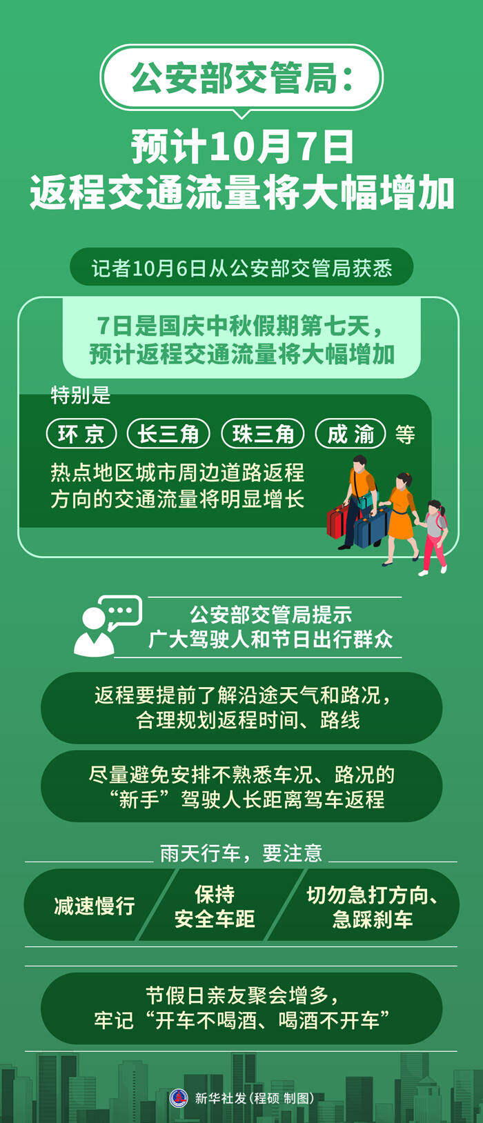 新华社北京10月6日电(记者任沁沁)记者6日从公安部交管局获悉,7日是国庆中秋假期第七天,预计返程交通流量将大幅增加,特别是环京、长三角、珠三角、成渝等热点地区城市周边道路返程方向的交通流量将明显增长。