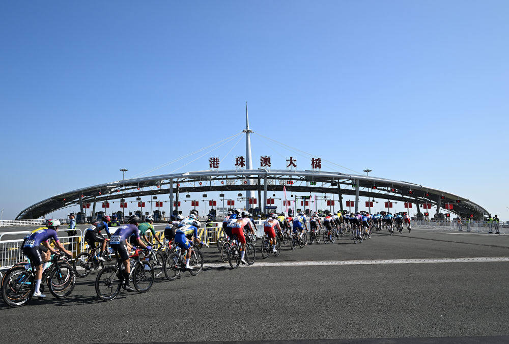 8日的港珠澳大桥上,十五运会公路自行车男子个人赛在风驰电掣中实现“一赛跨三地”。