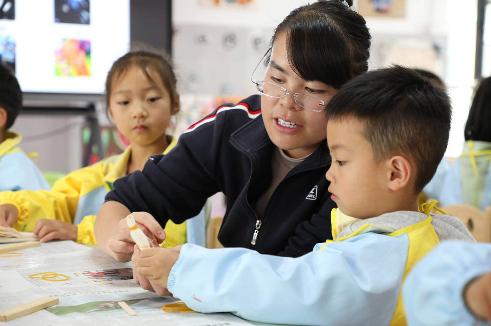 为把扎染活动搬进课堂,幼儿园特地邀请当地苗族扎染匠人对老师进行系统培训,孩子们也在不断实践探索中学习了不同的捆扎方法,逐步积累了图案和捆法之间的经验。当作品在阳光下展开,青白相间的纹路仿若山川脉络,映照出马龙大地的文化肌理,也悄然在幼小心灵播下文化传承的种子。