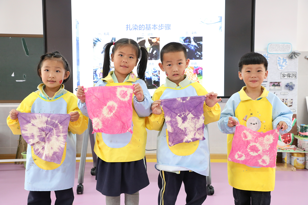 幼儿园为孩子们精心准备了安全无毒的植物染料和纯棉布料。在老师的示范下,孩子们发挥天马行空的想象力,有的将布料揉成一团系紧,有的折叠出工整的条纹,有的用皮筋固定出几何图案。完成折叠、捆绑之后,孩子们小心翼翼地将布料浸入不同颜色染料中。当包裹的布料被拆开,原本单调的白布上呈现出独一无二的花纹时,活动室里响起阵阵欢呼:“我的手帕像天空的云朵。”“我的像彩虹。”“我这个像雪花。”“我的像大风车。”“我的手帕上有好多小花朵。”“我的像一只蝴蝶。”……孩子们争先恐后地展示自己的作品,一张张稚嫩的脸上洋溢着成功的喜悦。