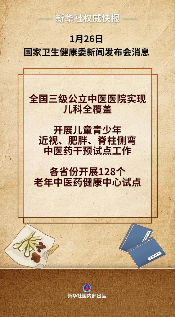 记者从国家卫生健康委1月26日举行的新闻发布会获悉,近年来,我国积极推动中医药提升全民健康水平,开展中医药健康促进行动,为青少年、妇女、老年人等重点人群提供中医药健康服务。来自发布会的数据显示: