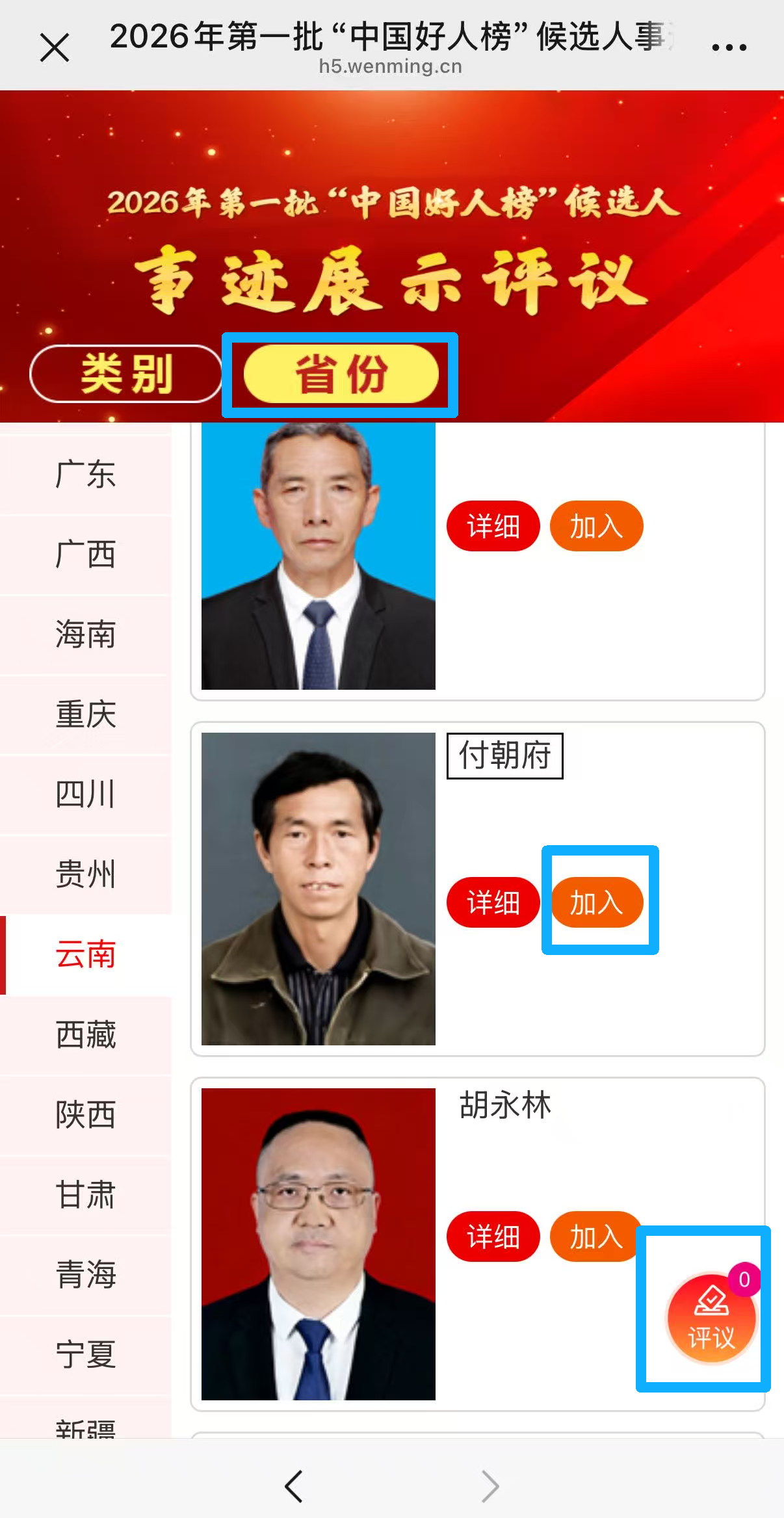 进入事迹展示评议页面 → 点击“省份”类别 → 选择“云南” → 点击“加入” → 点击右下角“评议”。
