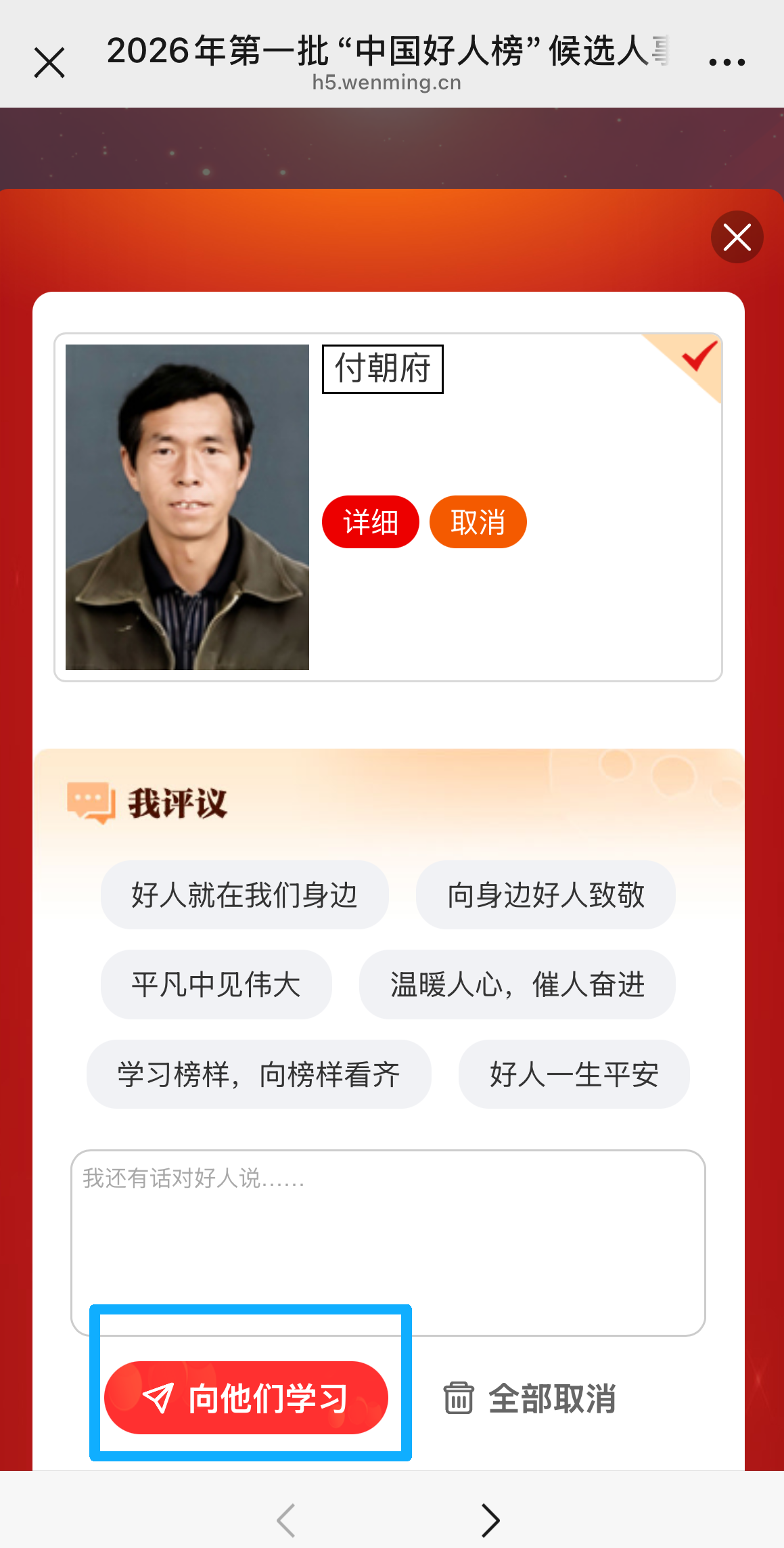 进入评议页面 → 点击“向他们学习”,即评议成功!
