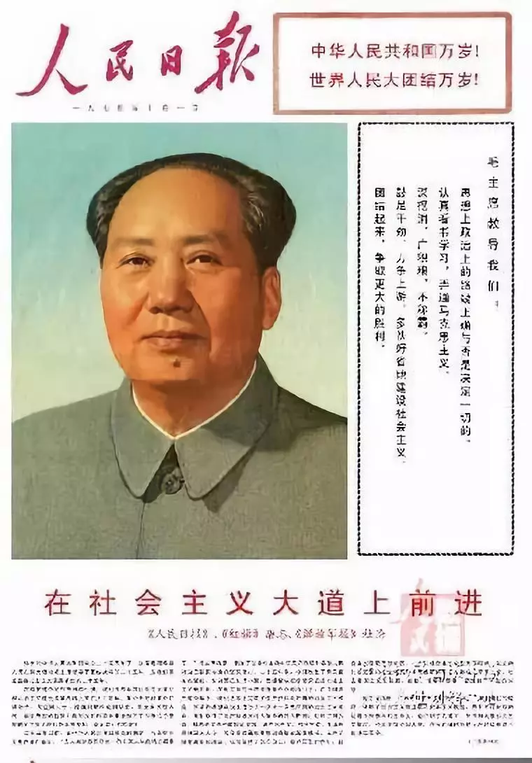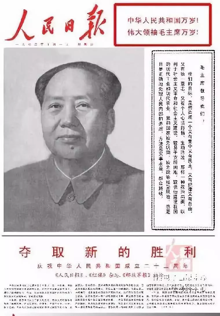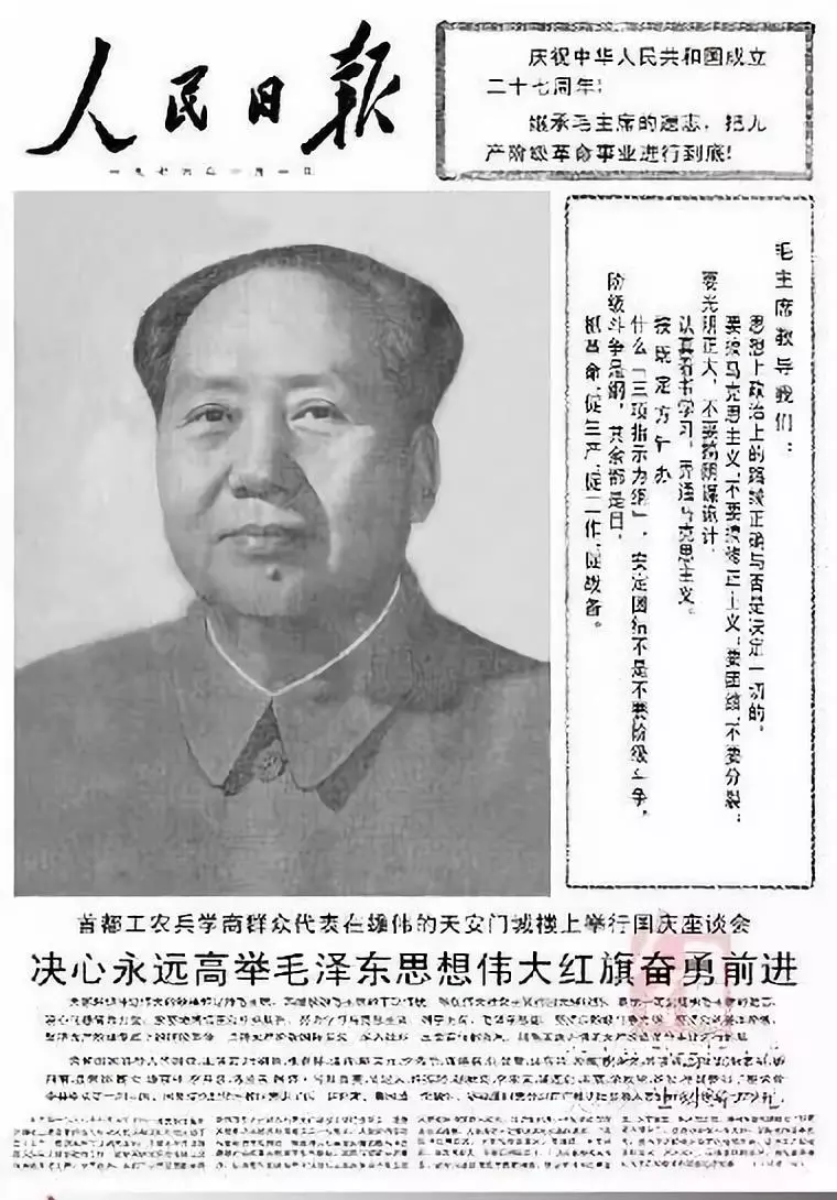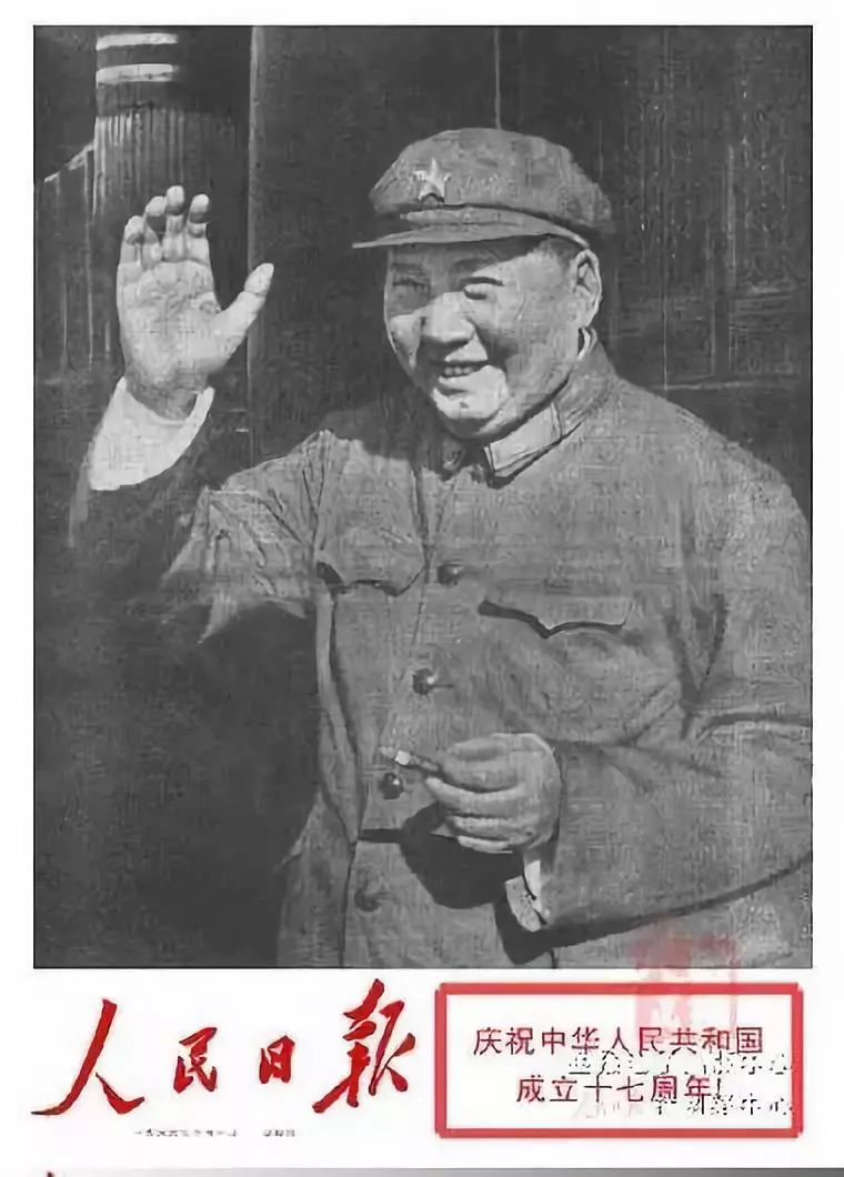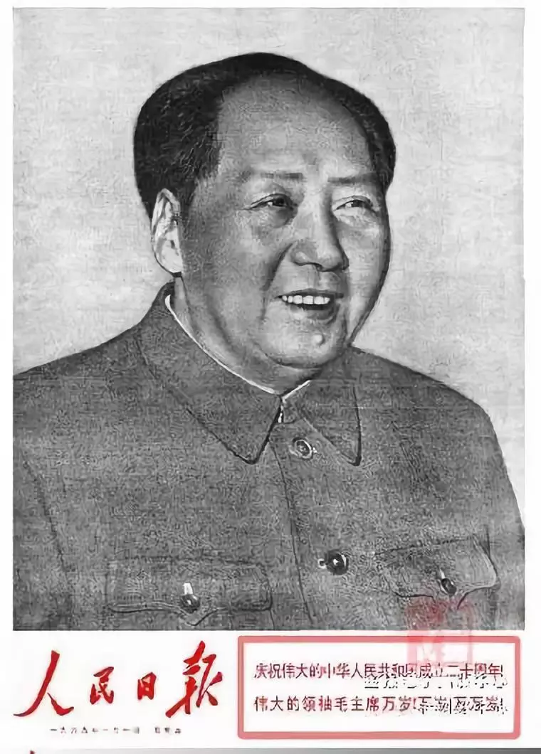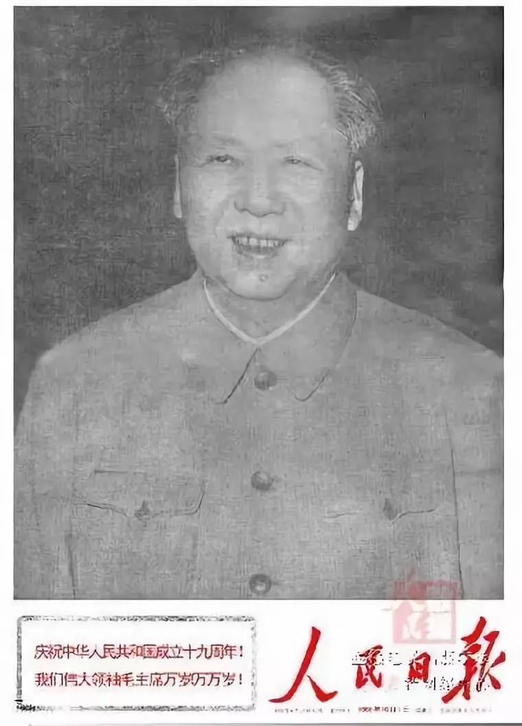 1949年10月1日新中国成立,当天的《人民日报》头版共刊出7张图片,均为开国元勋肖像。1949年国庆日头版的毛泽东肖像头戴八角帽身着军便服,是时任新华通讯社人像室主任郑景康在陕北为毛泽东拍摄的一幅生活照,也是悬挂于天安门城楼上的第一幅毛泽东画像。