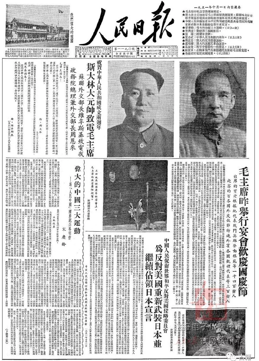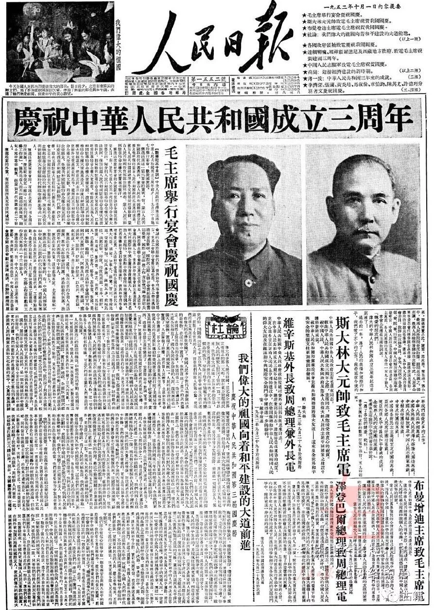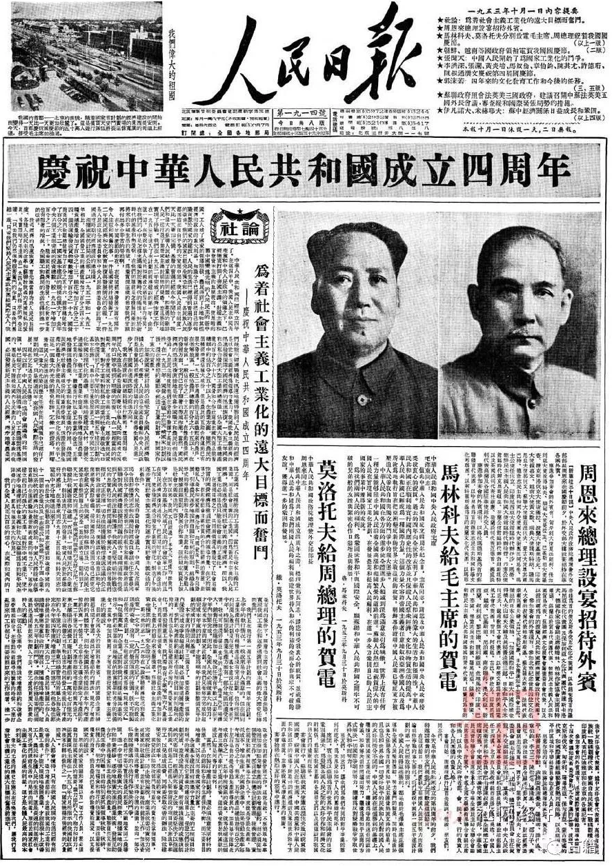 1950年至1953年的国庆日头版将毛泽东与孙中山的肖像照片并列刊出,且篇幅分配与视觉设计一致,这与当时的社会环境密切相关。