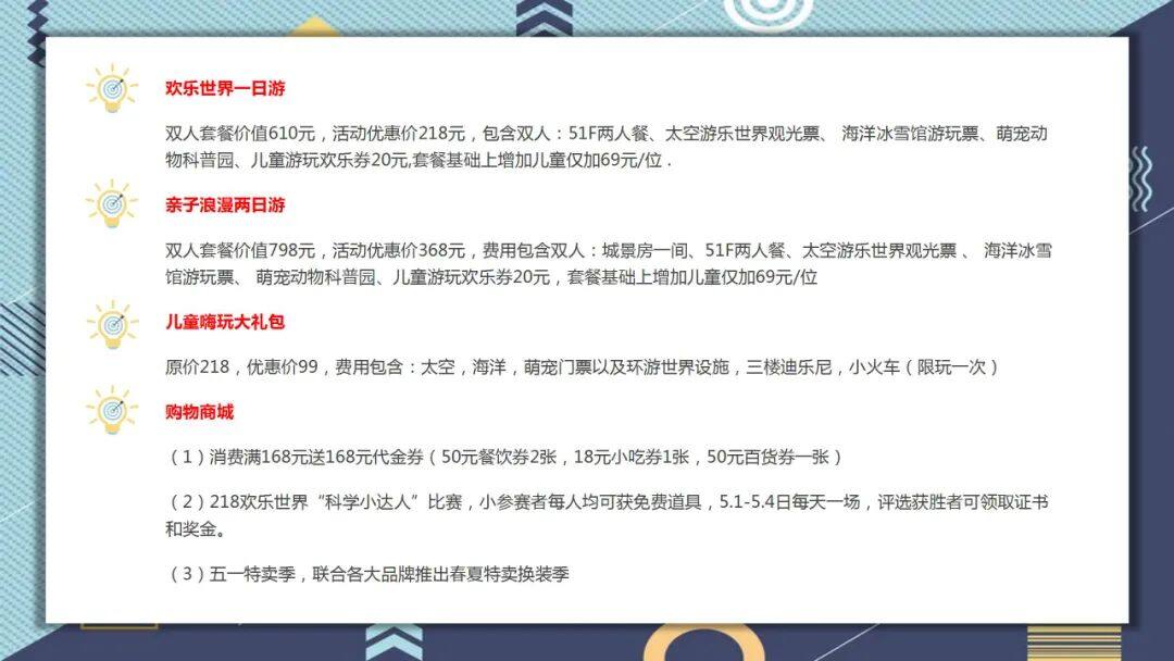 套餐价值610元,活动优惠价218元,包含双人:51F旋转餐厅两人餐、太空游乐世界观光票、 海洋冰雪馆游玩票、萌宠动物科普园、儿童游玩欢乐券20元)