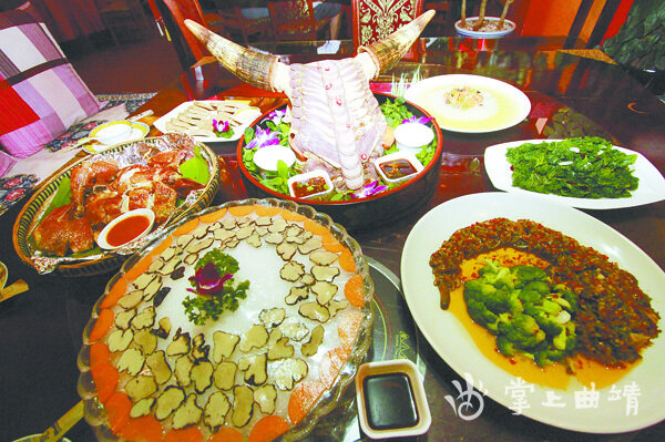 在将军镇往里走大约六七百米的地方有一家名为香格里拉臧龙雪珍牦牛的藏式风情餐厅,这算是曲靖唯一一家以鲜明的民族文化为主题的餐厅。走进这家餐厅,豪爽热情的藏族老板扎西江措会让你觉得亲切、温暖,餐厅里转经筒、色彩鲜艳的藏式帷幔、储物柜等极具藏族特色文化元素的装饰也会让你感觉仿佛置身于千里之外的美丽西藏,菜品自不用说,也是别有一番风味。
