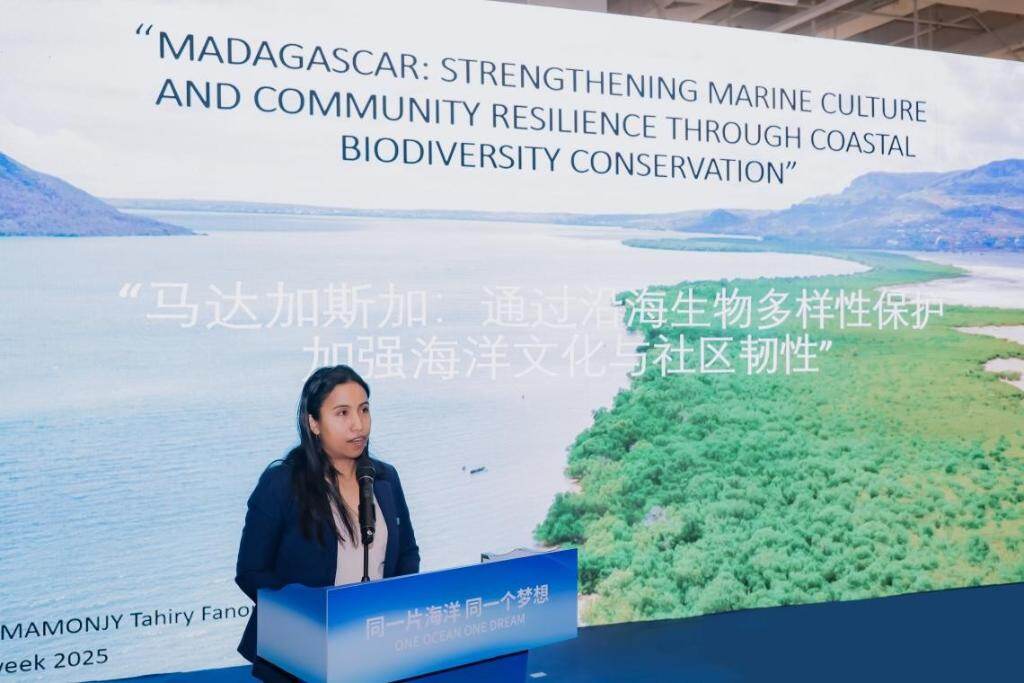 2025年10月29日,马达加斯加环境与可持续发展部官员塔希里·拉库图马蒙吉在2025中国海洋经济博览会活动中发言。(国际红树林中心供图)