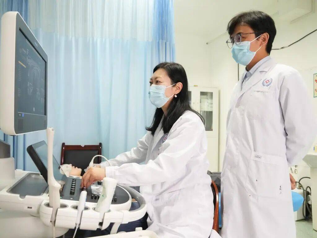 在西藏自治区人民医院医生在为患者进行超声检查。新华社记者丁汀摄