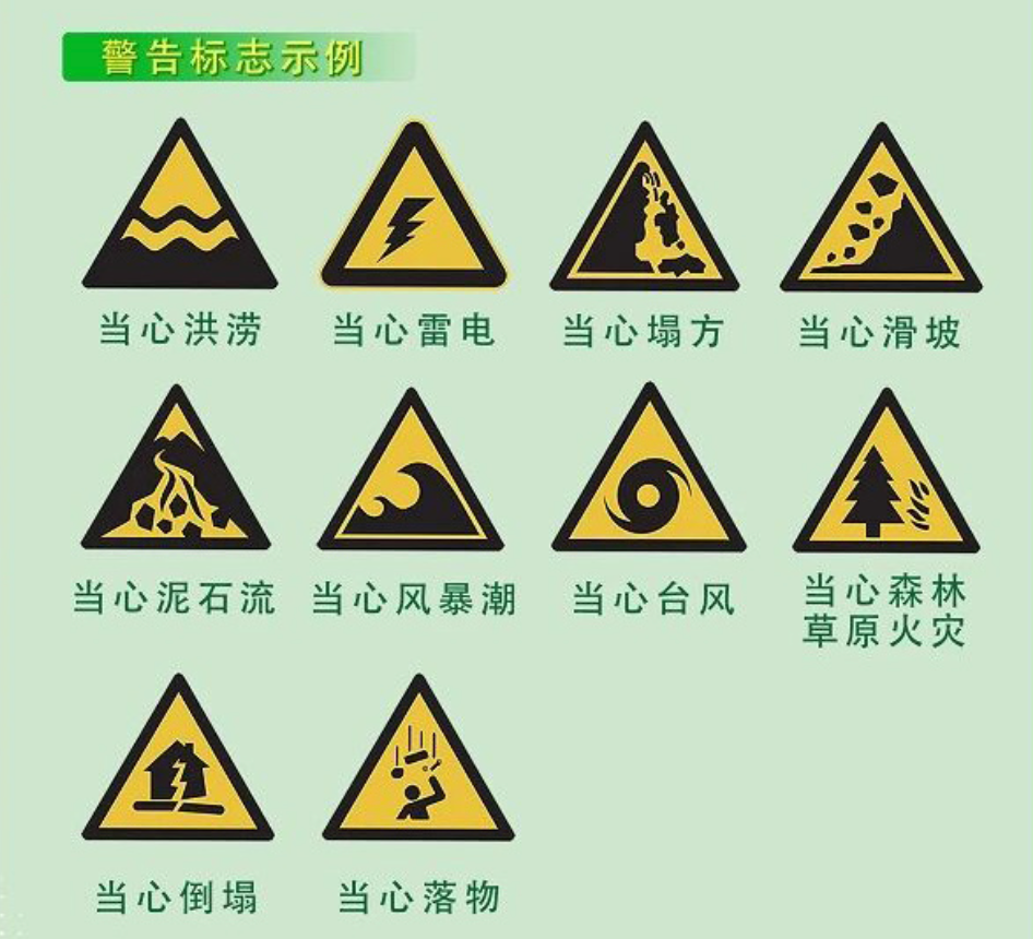 标明社区内易出现的自然灾害风险隐患的类型和位置,包括当心洪涝、当心雷电、当心塌方、当心滑坡、当心泥石流、当心风暴潮、当心台风、当心森林草原火灾、当心倒塌和当心落物。