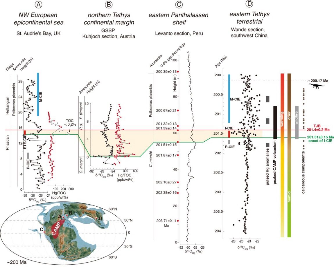研究人员首先通过有机碳同位素、汞含量及汞同位素等多个指标,识别出中大西洋大火成岩省岩浆作用导致的剧烈环境波动信号;与英国、奥地利、秘鲁等经典剖面的精细对比,确定了万德剖面的三叠纪—侏罗纪界线位置。然后利用360余米的岩芯中所测得的近3500个自然伽马序列数据,建立了以405千年(kyr)长偏心率周期为标尺校准的三叠纪—侏罗纪转折期天文年代框架;通过高分辨率有机碳同位素曲线与拥有多个高精度地质年龄限定的秘鲁北部Levanto剖面进行对比,将万德剖面记录的有机碳同位素在三叠纪最晚期的负向漂移事件(I-CIE)年龄确定为201.51±0.15百万年(Ma)前。最后以该年龄为锚点,将吴氏武定龙的产出地层限定为侏罗纪最早期的赫塘期,即距今约2.0017亿年。