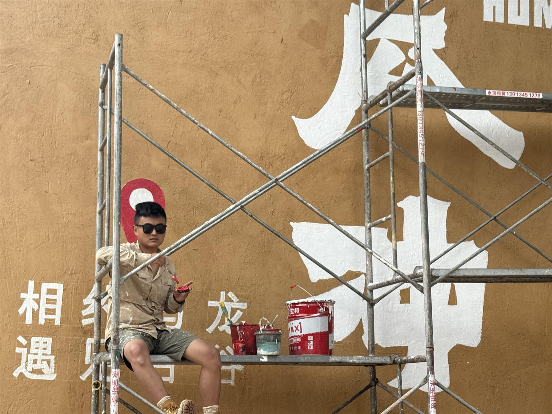 “北漂八年,画过许多墙,但最想画的,还是家乡的那面土坯墙。”2019年底,蔡迷鼠打包好北京的画具,带着四年大学生活、两年军旅生涯和两年美术教育工作经验的积累,毅然回到家乡曲靖,最终选择在马龙区土瓜冲村落脚。彼时的土瓜冲还是个略显沉寂的“空心村”,他却看中了这里闲置房屋的榫卯结构、土坯墙面—那是天然的“岩彩画布”。