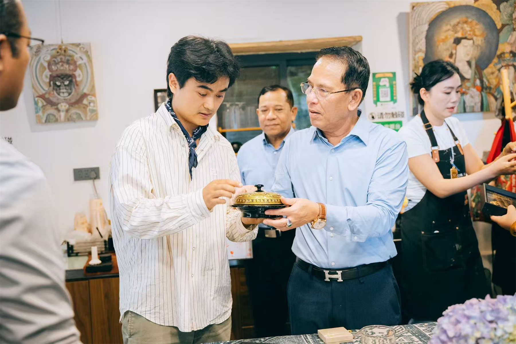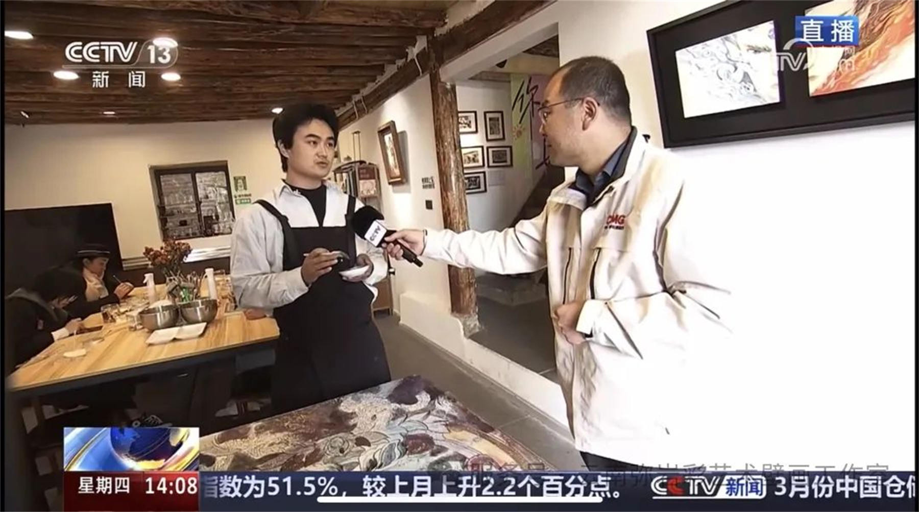 “艺术能让乡村变美,更能让乡村‘活’起来。”蔡迷鼠的岩彩梦,从来不止于创作—他要让艺术成为乡村振兴的“催化剂”。在他的带动下,土瓜冲村跳出“空心村”困境,形成“艺术+休闲+旅居”的新模式。云南省委书记王宁在新华社专访中提到:“云南旅居产业走红,源于曲靖一个叫土瓜冲的村子……”2025年4月,CCTV13新闻直播走进土瓜冲,镜头里的岩彩创作让全国观众记住了这个马龙小村;同年,全球南方媒体智库高端论坛缅甸代表团一行到访,蔡迷鼠组织“共绘友谊之画”活动,互相签名留下纪念作品,非遗烧箔与缅甸手工漆器的交换,让土瓜冲成了跨越文化交流的“小窗口”。