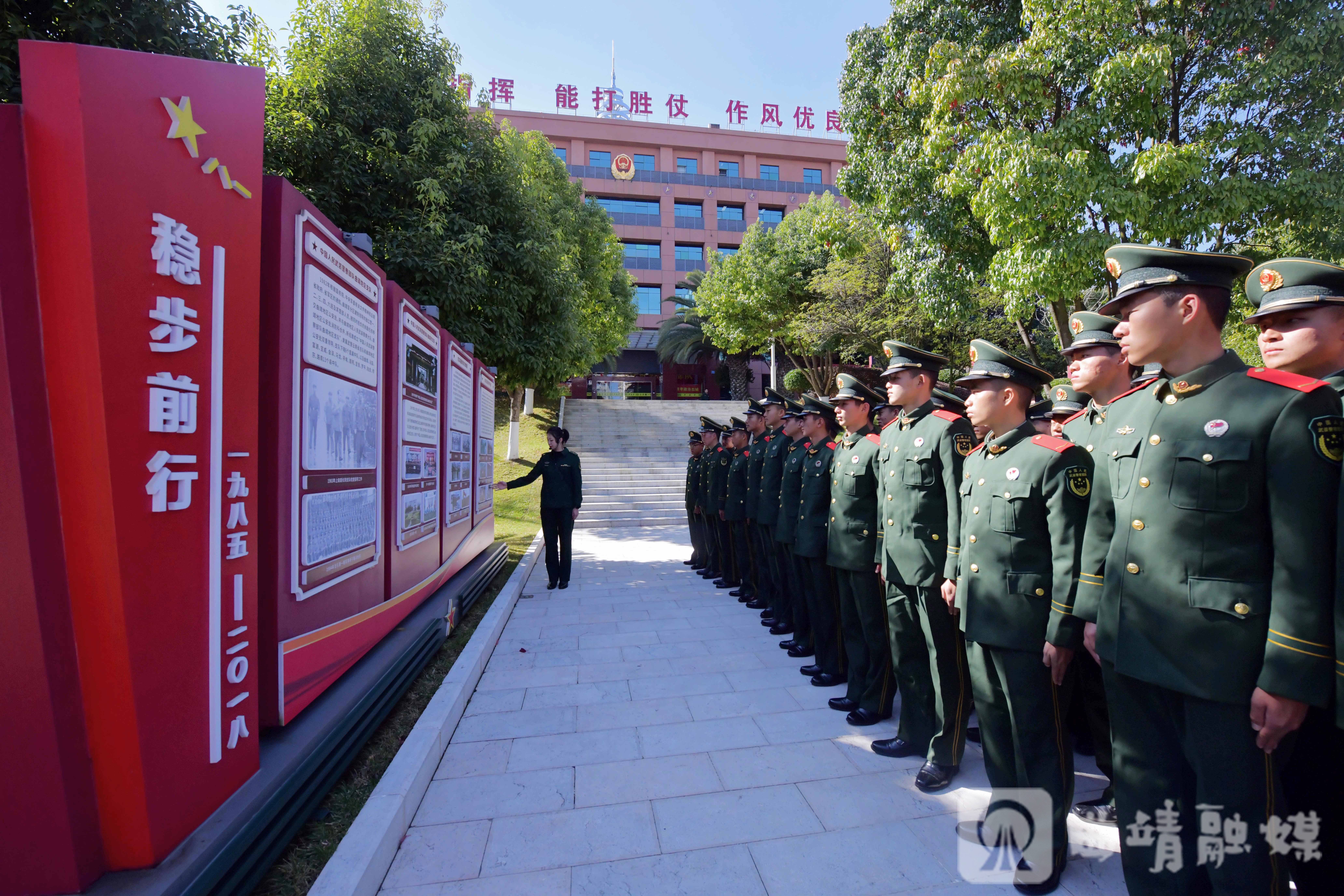 授课结束后,新兵们列队走进营区,开展红色文化阵地参观学习。在机关楼前,整齐排列的6块电子屏正循环播放支队近年来实战化训练、应急救援等场景,生动展现了官兵英勇顽强的战斗作风。两侧宣传展板上,“两个确立”“两个维护”等内容在晨光中更是格外醒目,为新兵们上了一堂生动的政治教育课,引导他们坚定政治方向、强化使命担当。