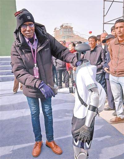 在第十一届新疆特色果品(阿克苏)交易会开幕式上,巴尔德与人形机器人互动。受访者供图