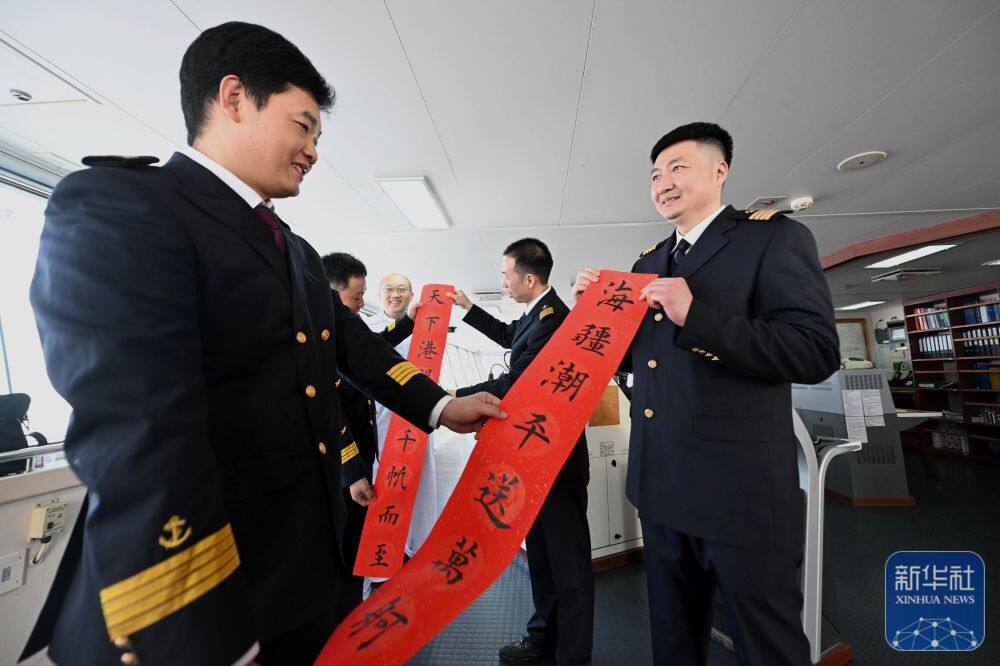 ↑ 2月4日,天津港引航中心引航员孙勃(右)在“中远海法”轮上向船长赠送春联。
