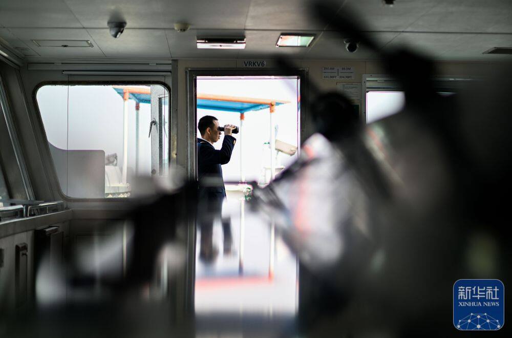 ↑ 2月4日,天津港引航中心引航员许钦平在“中远海法”轮上通过望远镜查看航道。