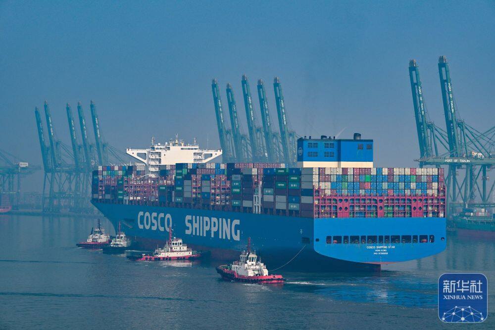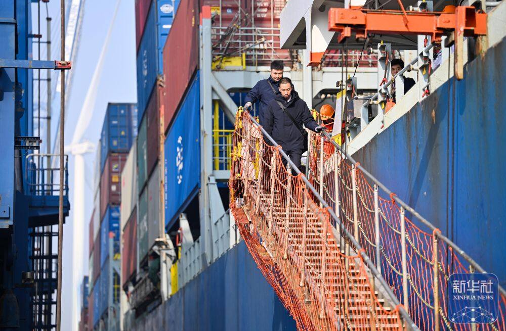↑ 2月4日,一艘集装箱货轮准备靠泊在天津港集装箱码头。