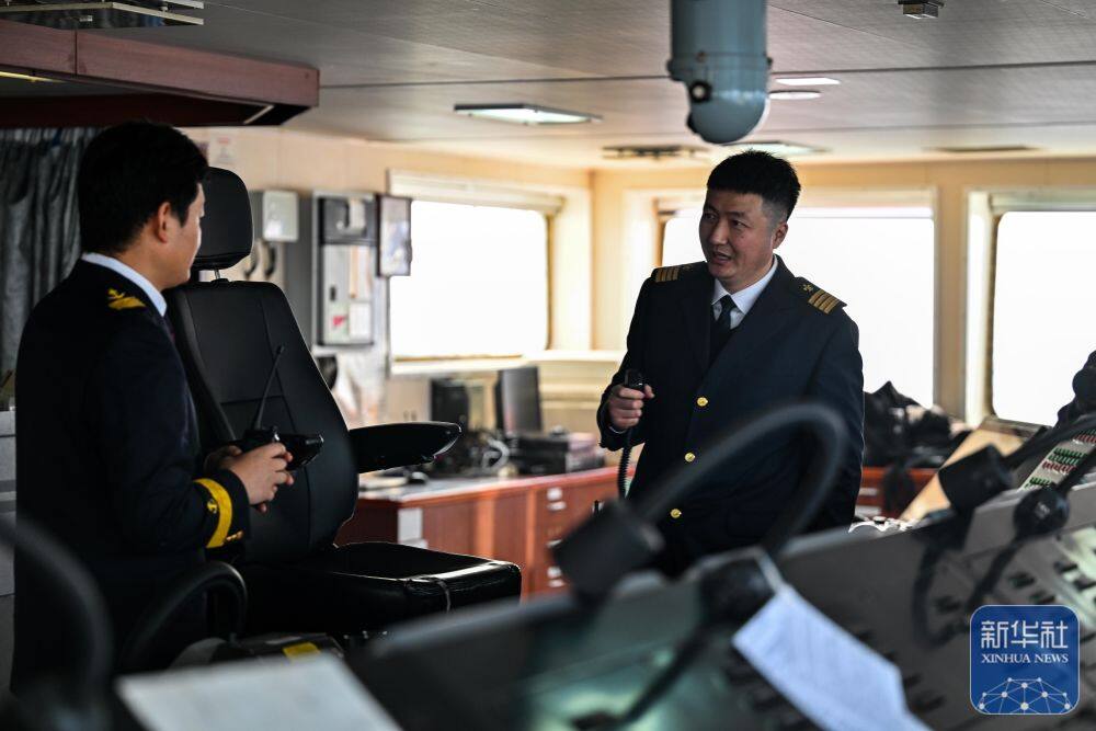 ↑ 2月4日,天津港引航中心引航员孙勃(右)在“中远海法”轮驾驶室和船长沟通。