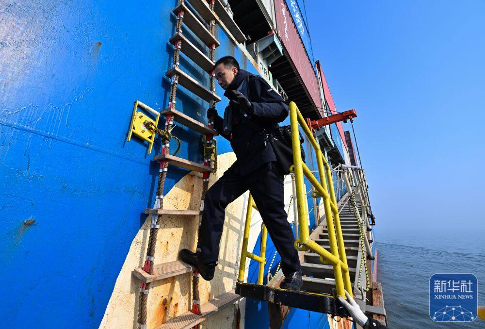 ↑ 2月4日,在天津港锚地,天津港引航中心引航员孙勃攀爬软梯,他将在登船后引航该船入港。