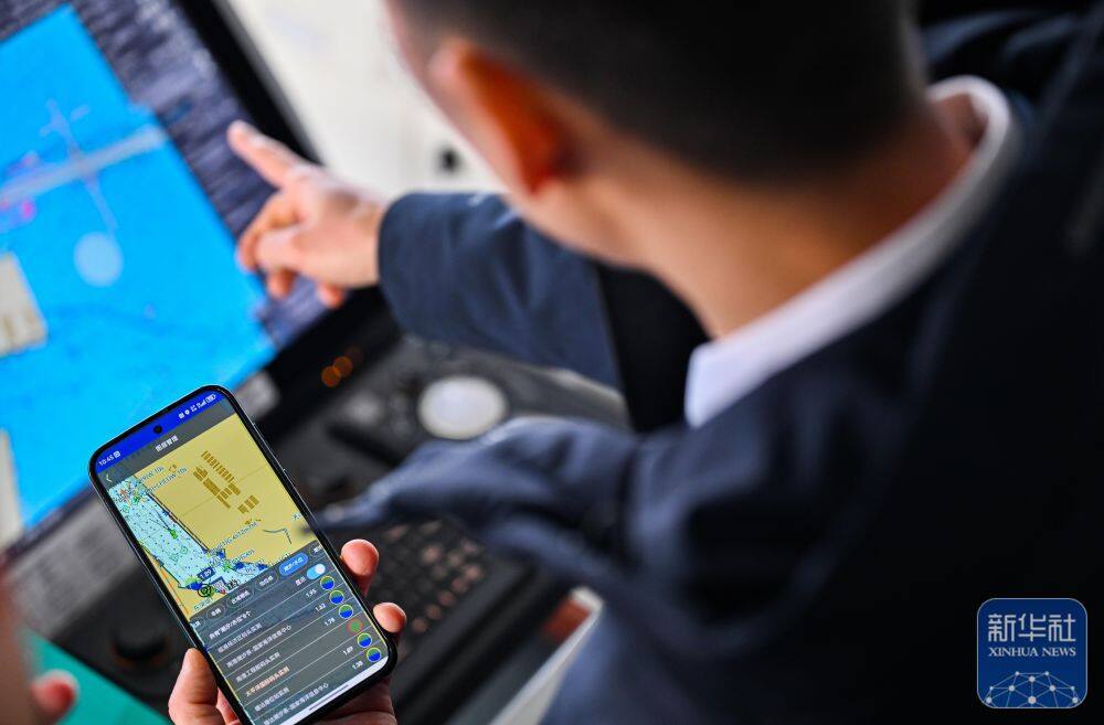 ↑ 2月4日,天津港引航中心引航员许钦平在“中远海法”轮上通过手机查看船舶动态。
