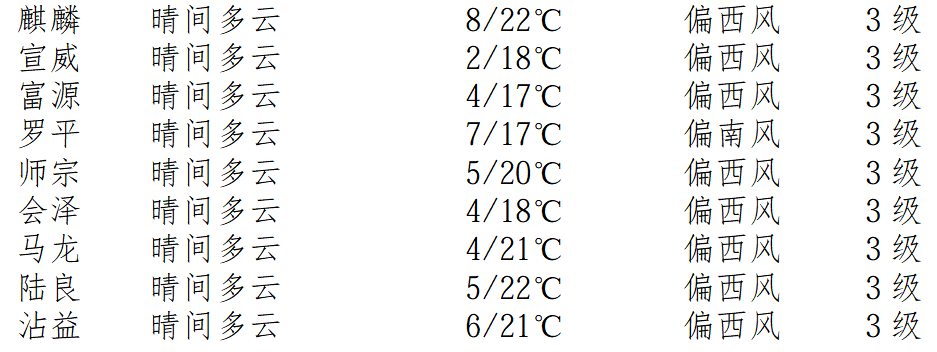 罗平、富源大部、陆良东部、师宗大部、沾益东部森林火险气象等级3级(较高),会泽、宣威、马龙、麒麟(含经开区)、富源西部、陆良大部、沾益大部、师宗南部森林火险气象等级2级(高)。