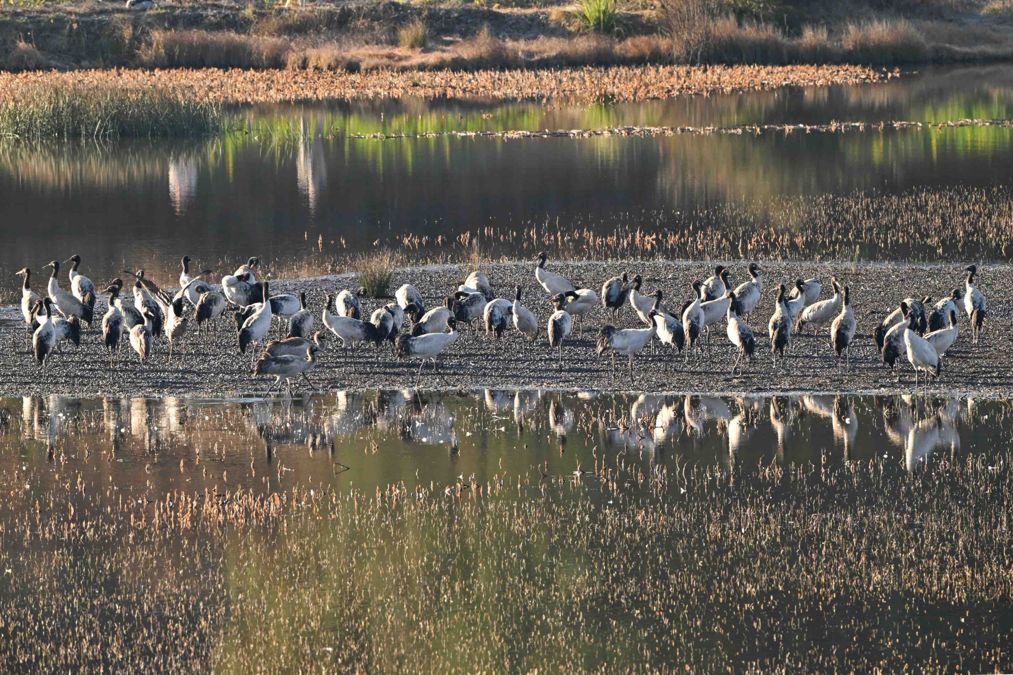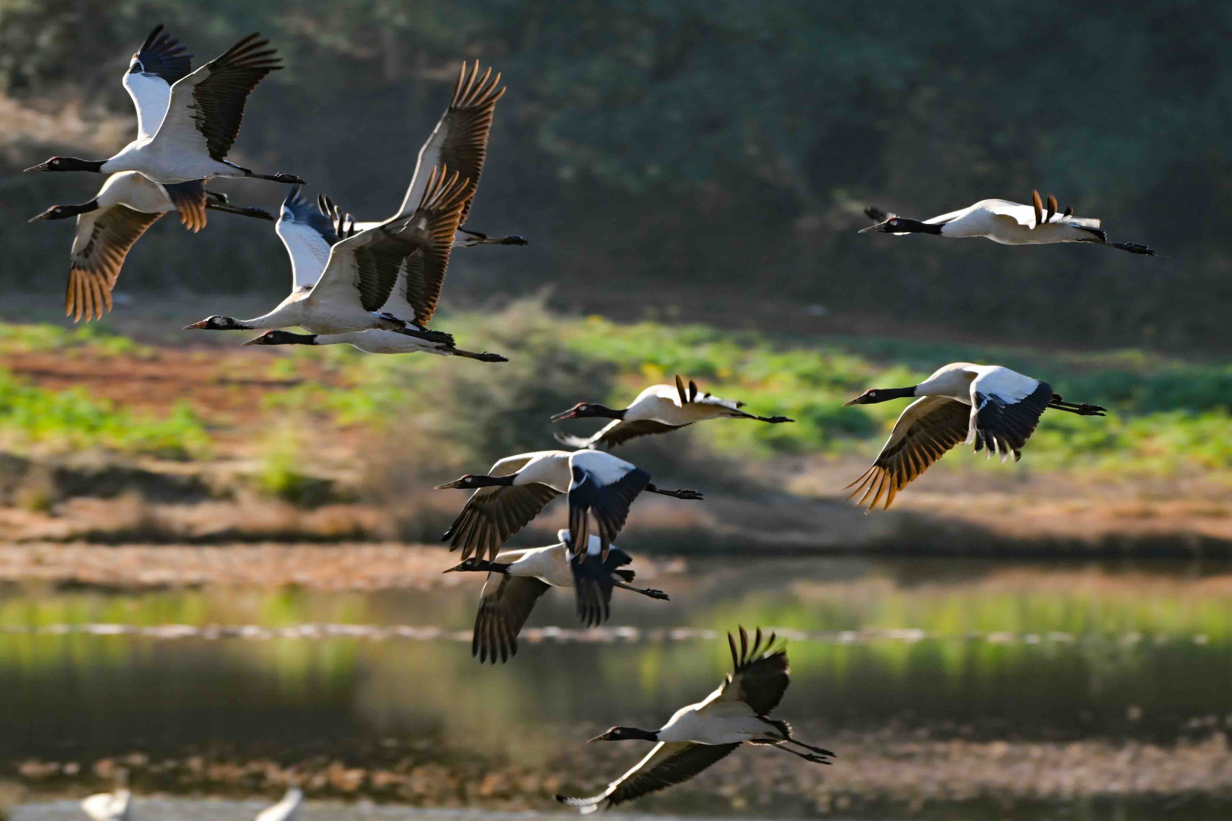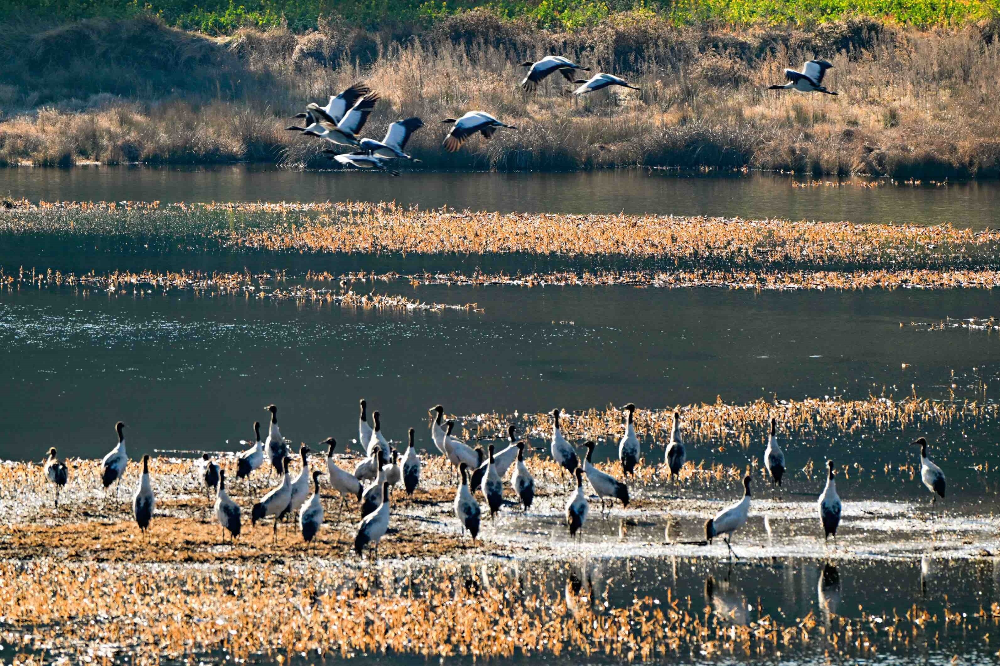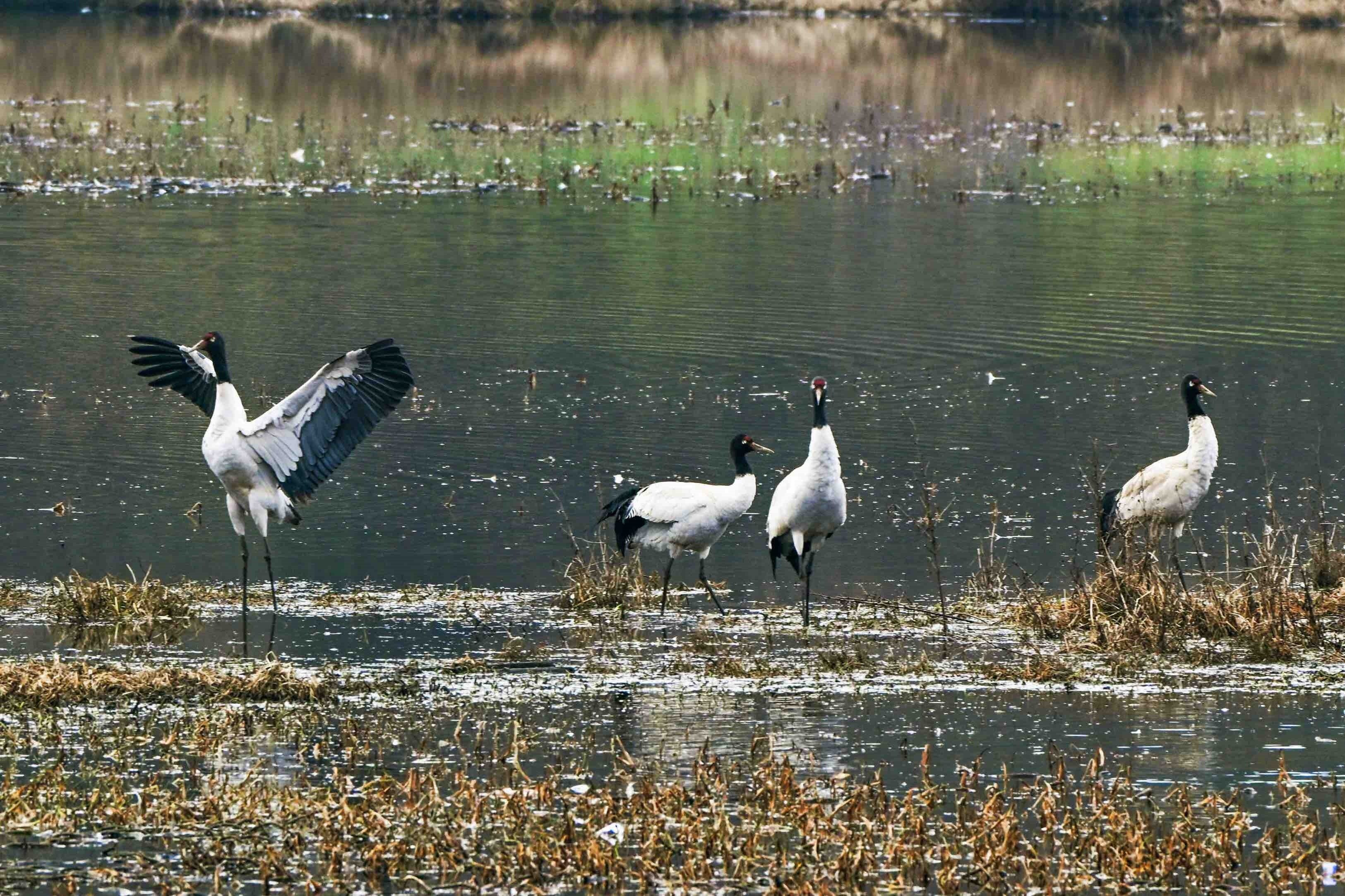 今年,位于云南省曲靖市会泽县的会泽黑颈鹤国家级自然保护区内,鹤类总数有所上升,达到1611只。念湖湿地内,越冬的黑颈鹤时而优雅踱步,时而振翅追逐,时而引颈长鸣,有的还展开双翼穿梭于云雾之间。