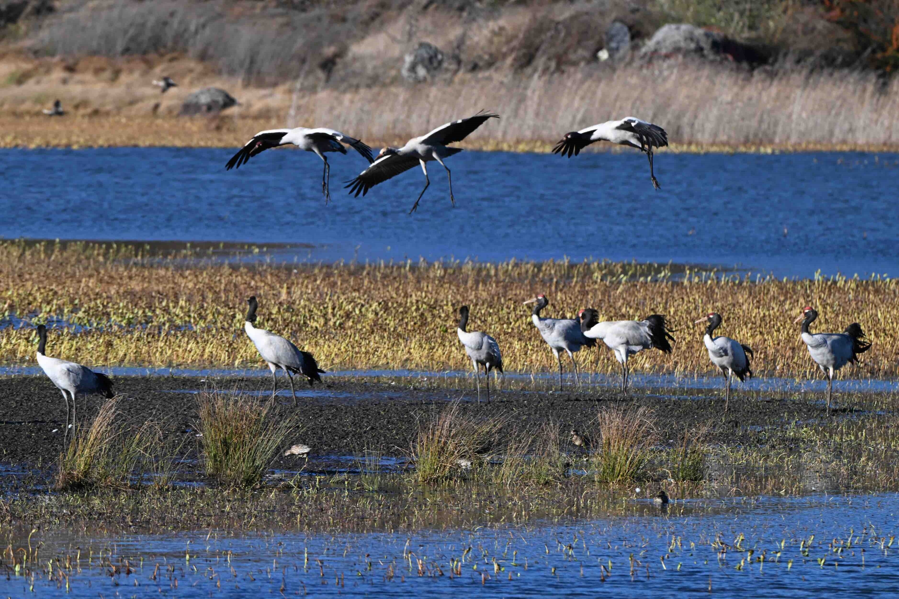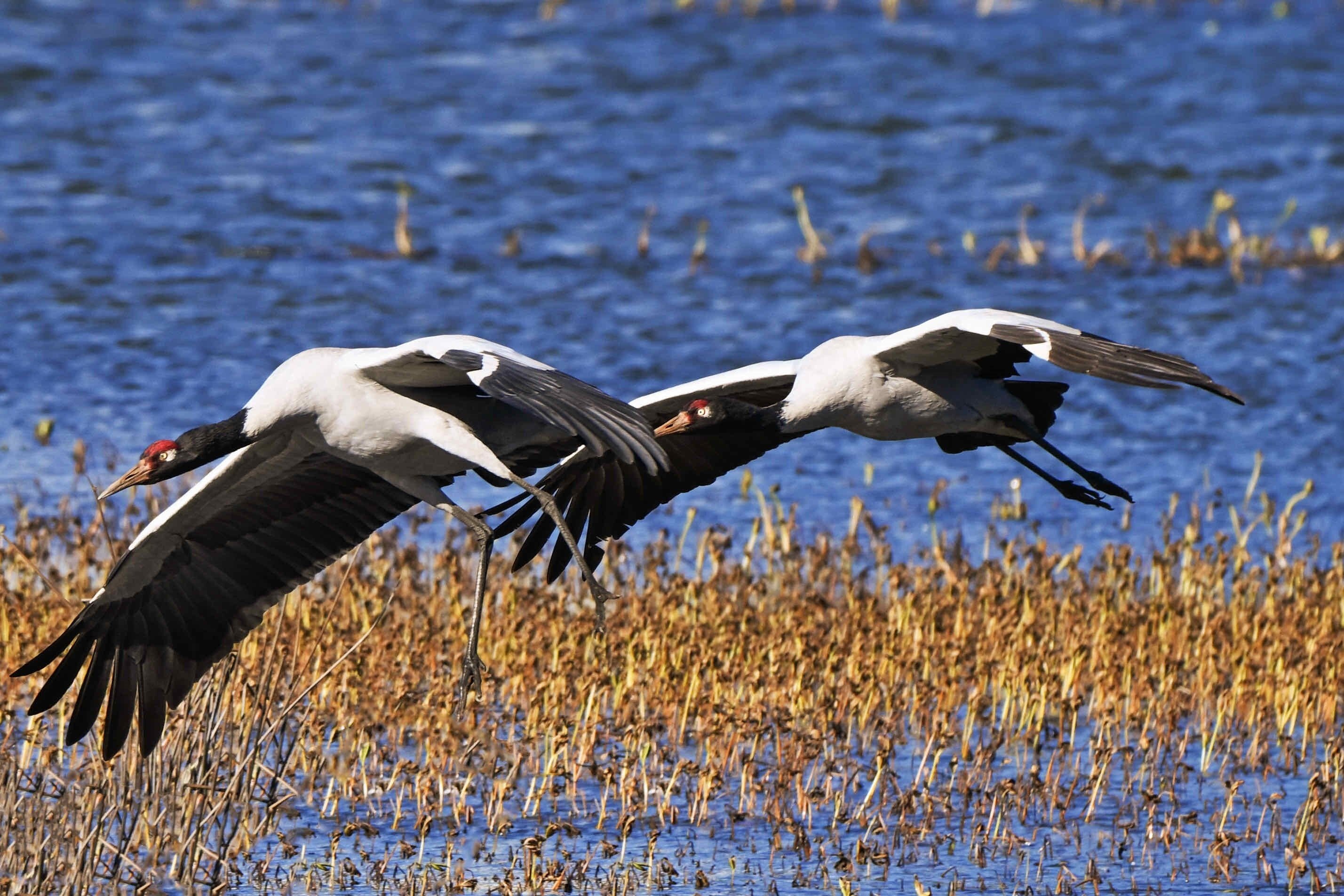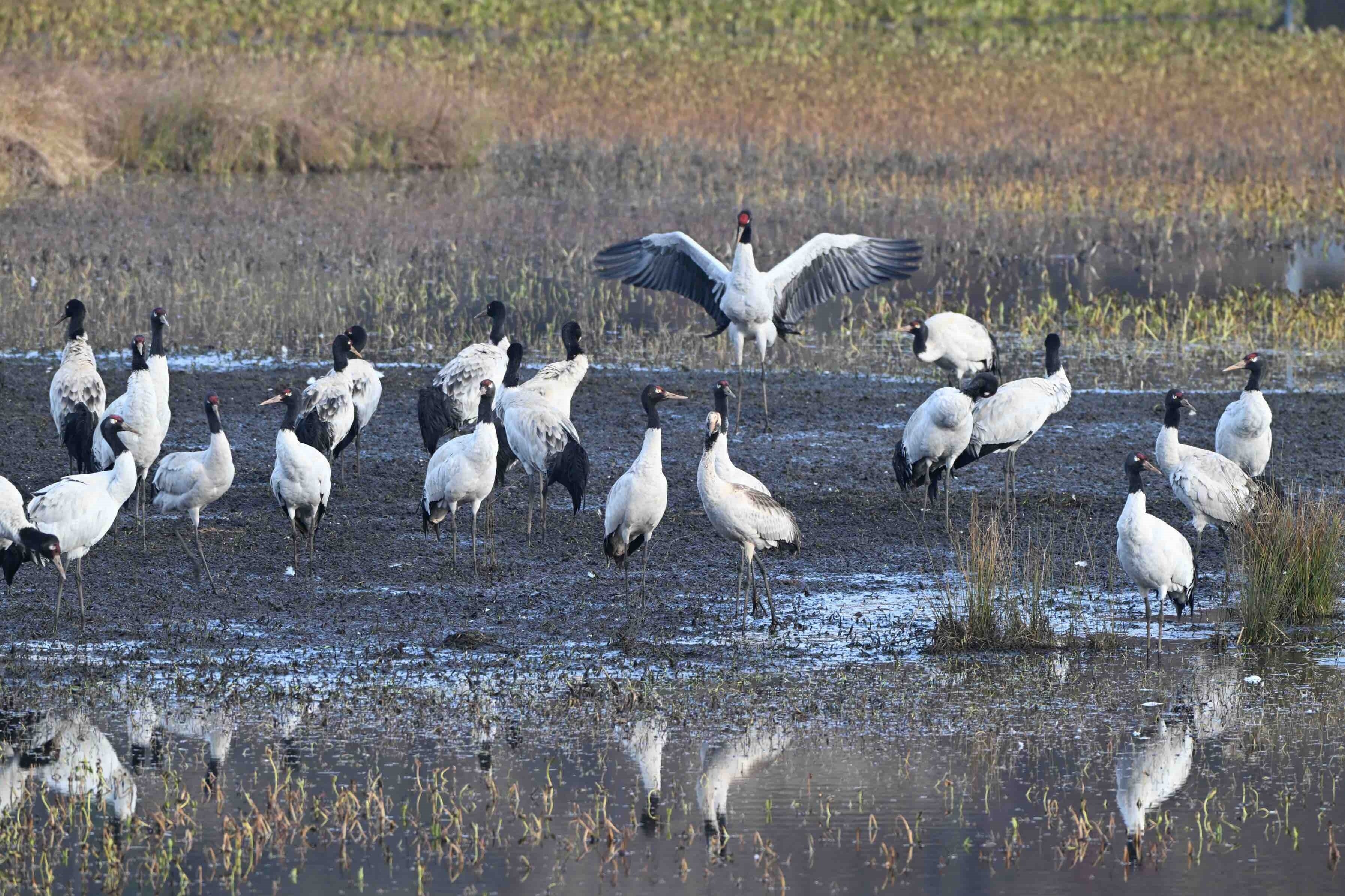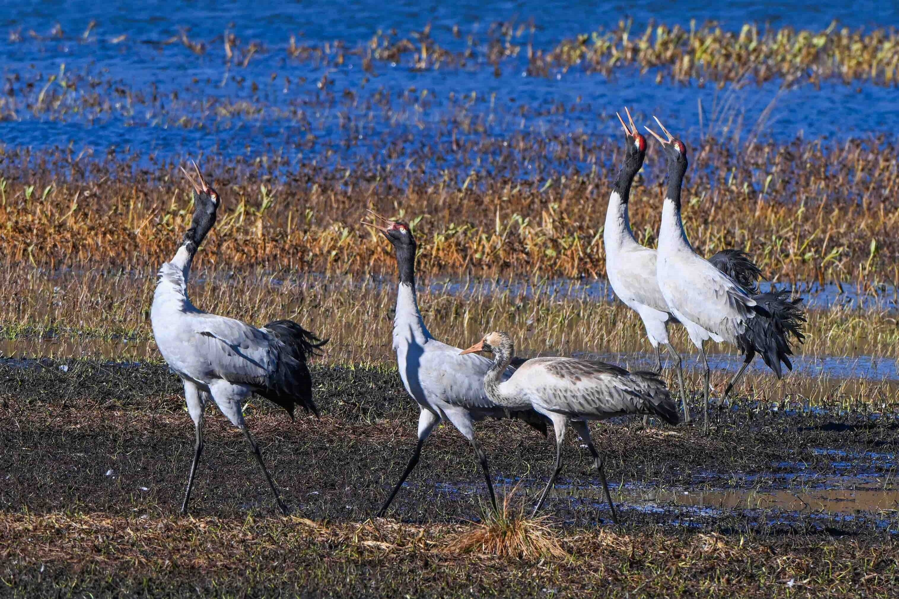 今年,位于云南省曲靖市会泽县的会泽黑颈鹤国家级自然保护区内,鹤类总数有所上升,达到1611只。念湖湿地内,越冬的黑颈鹤时而优雅踱步,时而振翅追逐,时而引颈长鸣,有的还展开双翼穿梭于云雾之间。