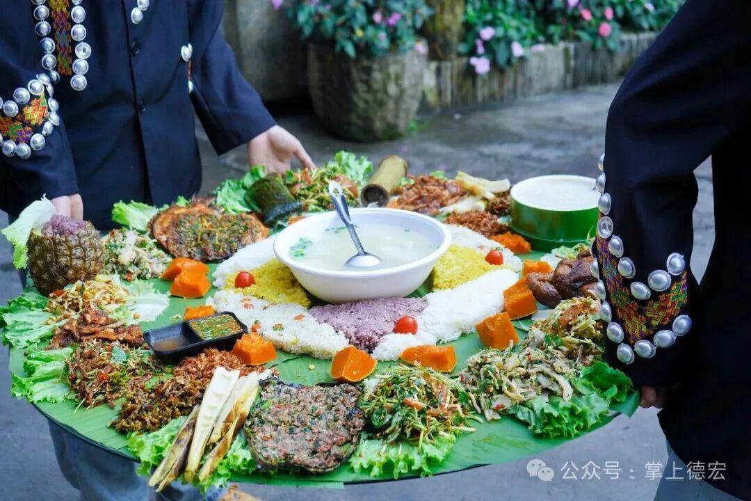德宏的手抓饭,把景颇族的鲜、香、野全端上桌。芭蕉叶铺底,四色糯米饭堆成小山,周围摆满香茅草烤鱼、烤五花肉景颇鬼鸡、舂干巴……不用筷子,直接上手抓:抓一把糯米饭,一块裹满腌菜膏的烤肉夹点酸辣的舂菜,捏成团塞进嘴里,糯香、肉香、野菜香在嘴里炸开,就是手抓饭的灵魂。