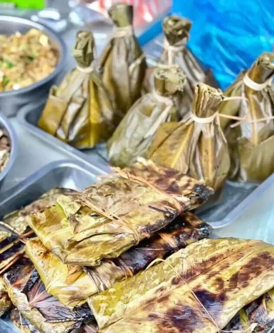 菠萝饭的鲜甜先在舌尖炸开,紧跟着是糯米的绵密回甘;青苔初尝微苦,像咬下一口带露的草木,细品之后,清鲜回甘缓缓漫开;烤鸡选用本地散养的土鸡,用盐、香茅草、柠檬叶、小米辣腌制入味,鸡皮金黄焦脆,鸡肉鲜嫩多汁、不柴不腻;包烧则是新鲜的芭蕉叶包住鲜鱼、鸡脚筋或是菌子,埋进炭火灰中慢煨,香茅草的独特清香、芭蕉叶的清甜与食材本身的鲜味深度交融。