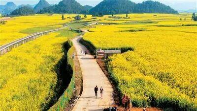 近日,云南省曲靖市罗平县的近百万亩油菜花迎春盛开,金灿灿的油菜花海吸引大量游客到罗平赏花过年,让当地的赏花经济迎来旺季。