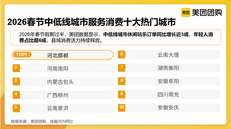 2026年春节假期已接近尾声,在返乡团圆、好友聚会、文旅深度游等多元场景带动下,全国中低线城市服务消费迎来强劲增长,成为春节消费市场的一大亮点。2月21日,美团发布春节假期节中休闲玩乐消费趋势显示,中低线城市休闲玩乐订单同比增长近3成,年轻人消费占比超6成,消费活力持续释放。云南景洪、大理跻身全国休闲玩乐消费TOP10热门小城。