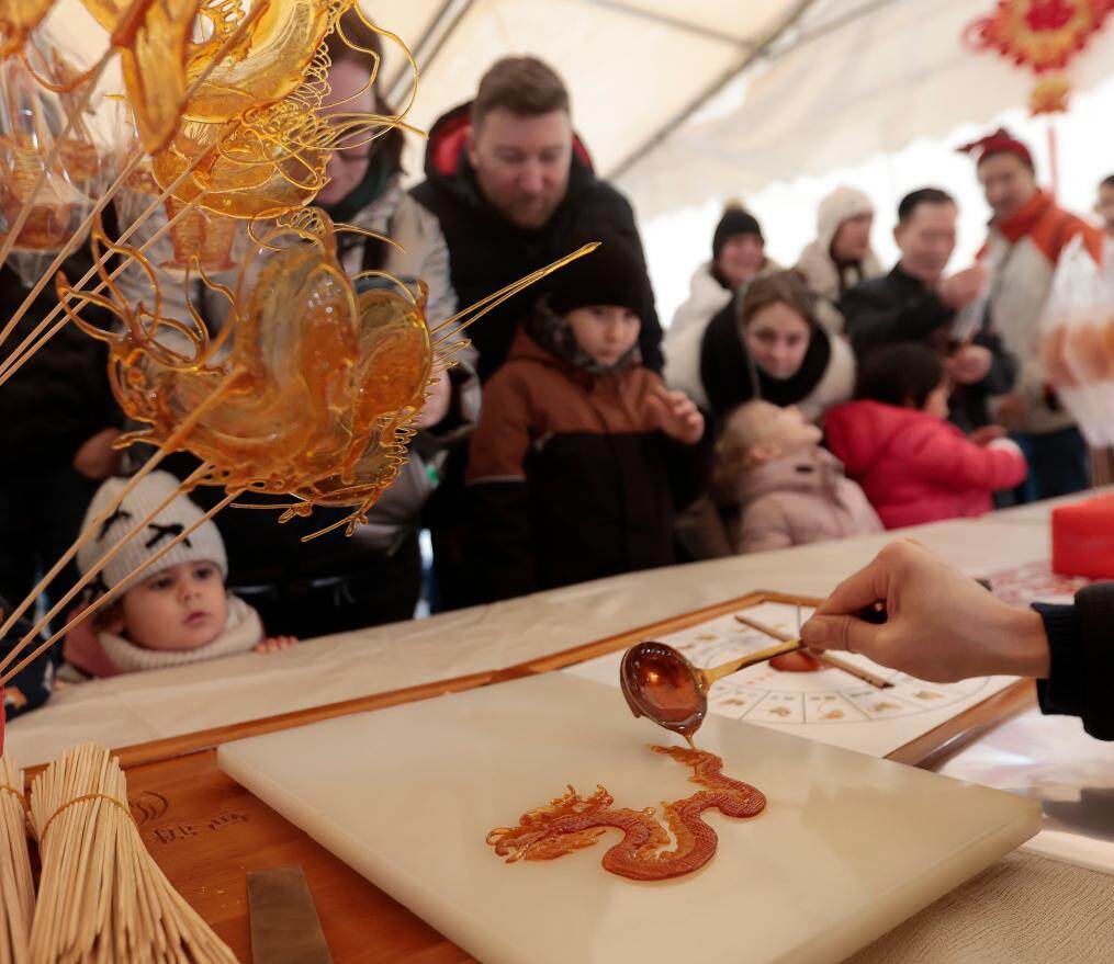2月7日,在匈牙利首都布达佩斯举行的唐人街新春庙会上,人们观看糖画制作。新华社发(鲍洛格·拉斯洛摄)