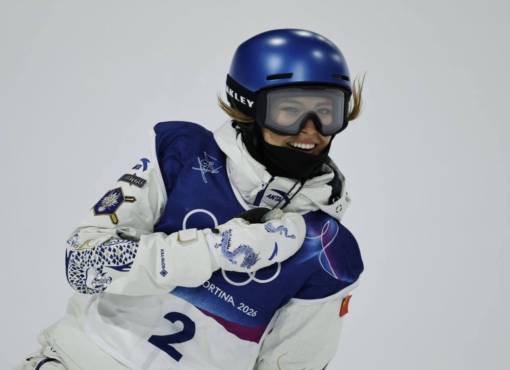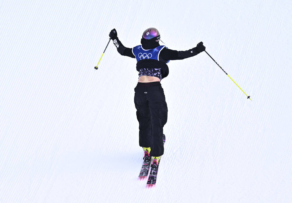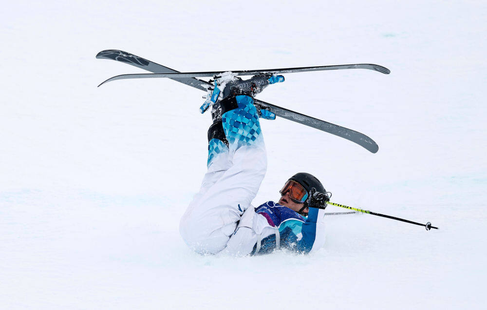2月9日,瑞士选手玛蒂尔德·格雷莫德在自由式滑雪女子坡面障碍技巧决赛中。她的腰间露出了拔罐后的印记。新华社记者 张宏祥 摄