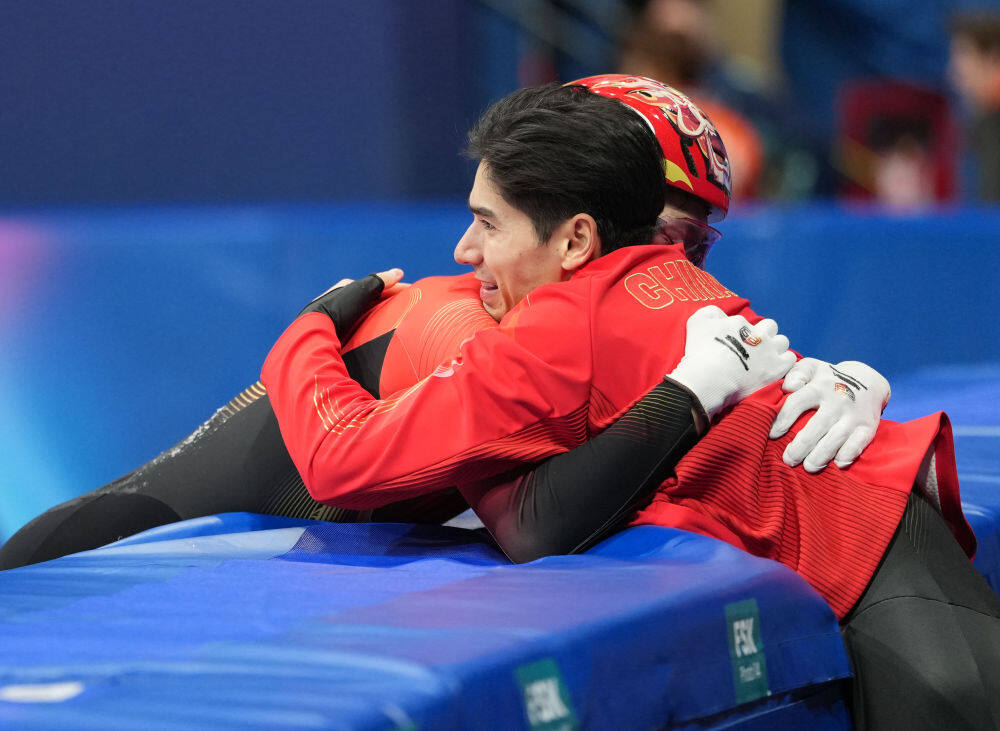 2月12日,孙龙(后)在短道速滑男子1000米A组决赛后和队友刘少昂拥抱。新华社记者 薛宇舸 摄