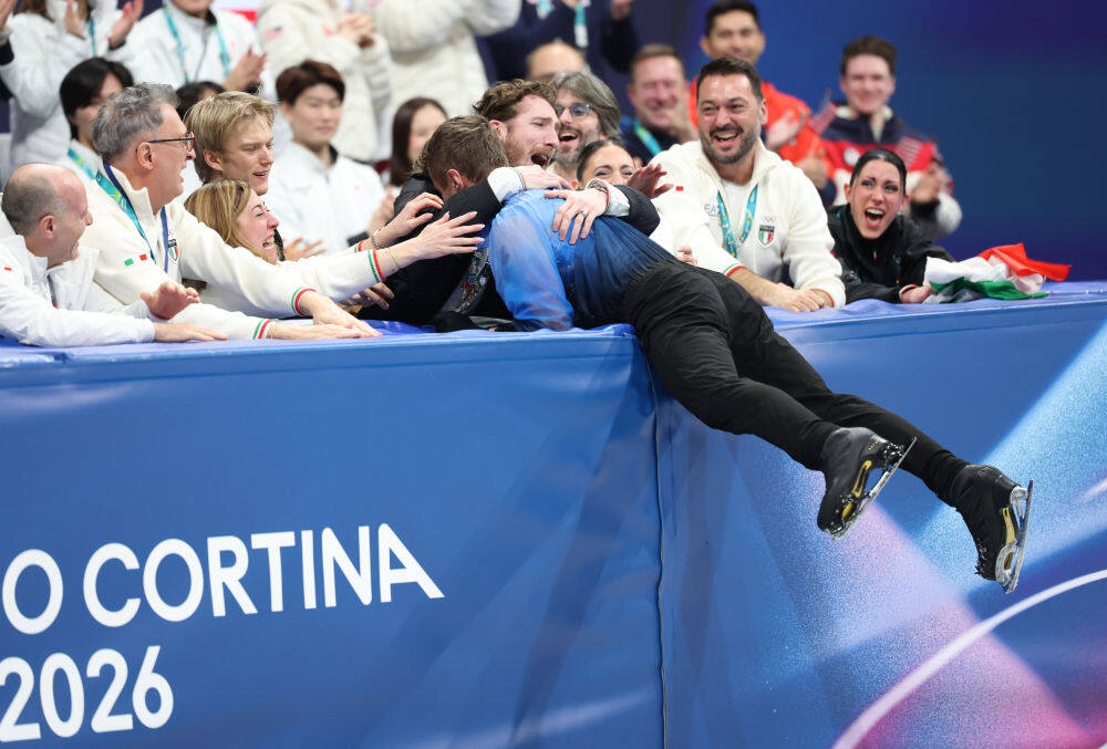 2月8日,意大利队选手里佐(中)在花样滑冰团体赛男单自由滑完赛后拥抱队友。新华社记者 李明 摄