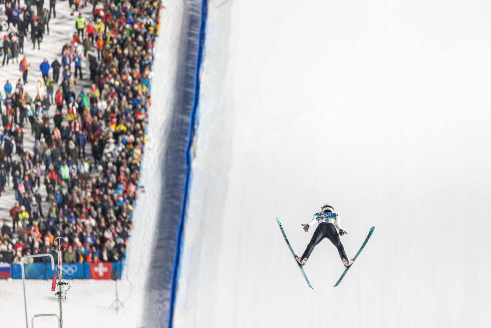 2月10日,中国队选手曾坪在跳台滑雪项目混合团体比赛中。中国队获得第八名,刷新了中国队在该项目上的历史最好成绩。新华社记者 黄伟 摄