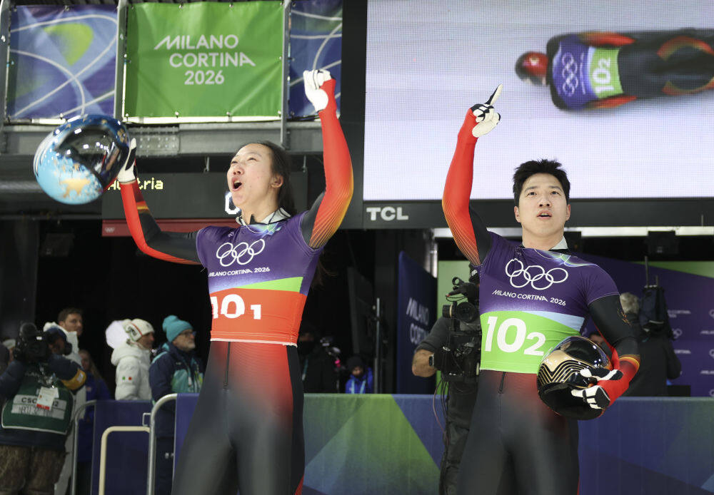 2月15日,中国队组合陈文浩(右)/赵丹在钢架雪车项目混合团体比赛后。他们获得第五名。新华社记者 丁旭 摄