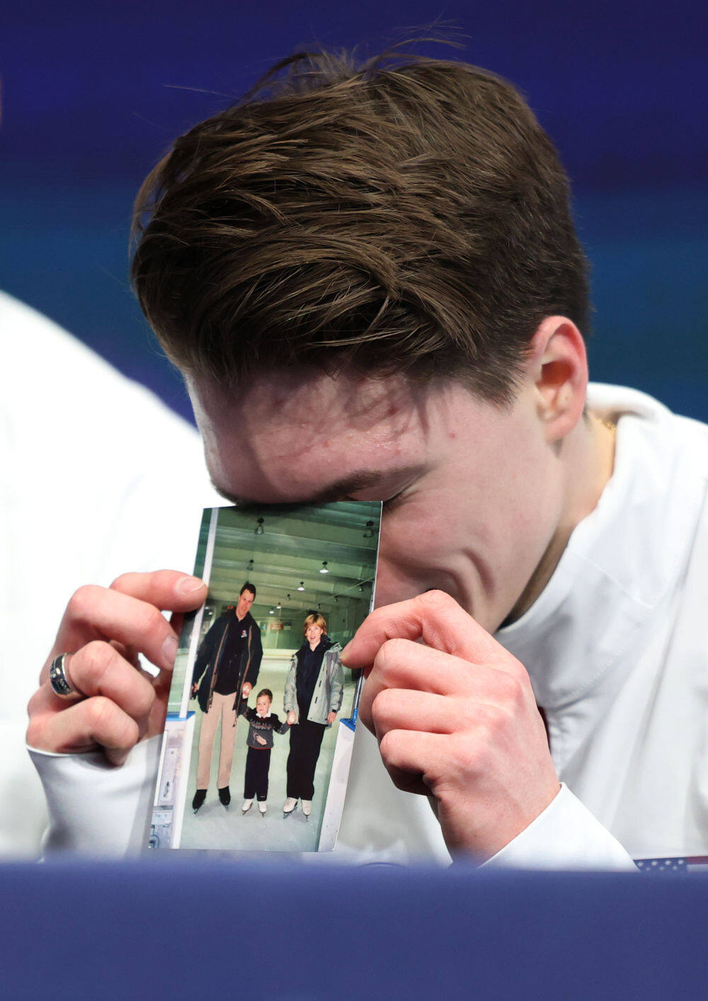 2月10日,米兰冬奥会花样滑冰男子单人滑短节目比赛举行,美国选手马克西姆·瑙莫夫赛后在等分区手持一张旧照片——那是三岁的他被父母牵着手站在冰面上。他的父母一年前在一场空难中去世,马克西姆·瑙莫夫带着深深的思念圆梦冬奥舞台。新华社记者 李明 摄