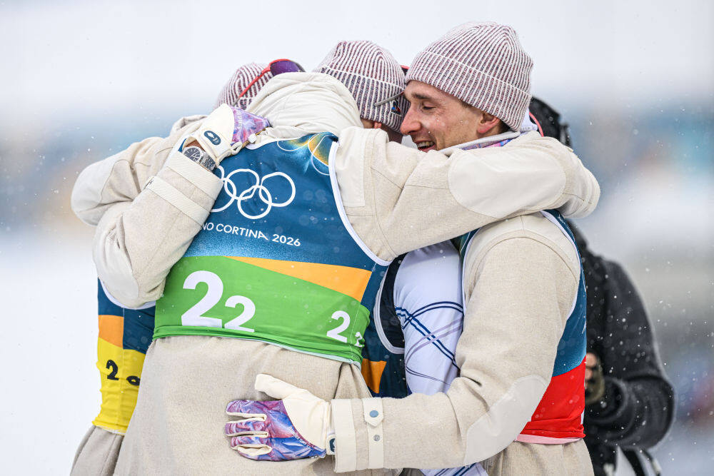 2月10日,获得越野滑雪男子个人短距离(传统技术)季军的挪威选手维凯(右)与获得冠军的队友克莱博拥抱时喜极而泣。新华社记者 彭子洋 摄