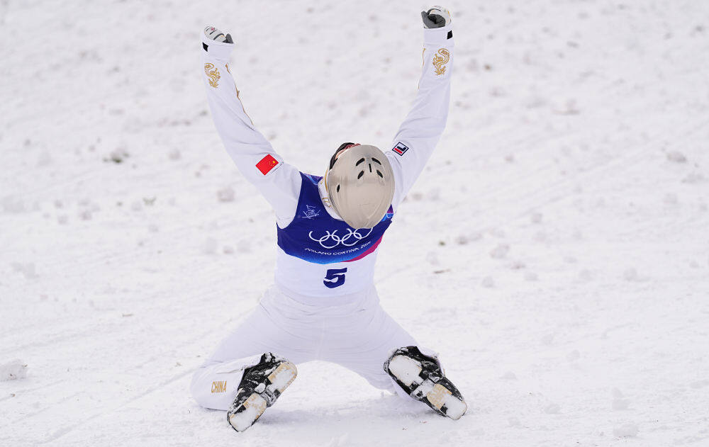 2月20日,王心迪夺得自由式滑雪男子空中技巧冠军后庆祝。新华社记者 邬惠我 摄