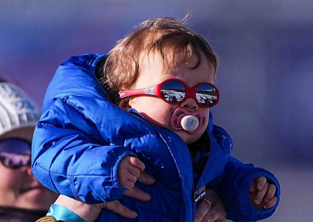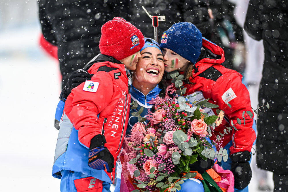 2月21日,小朋友在冬季两项女子12.5公里集体出发比赛后亲吻赛后将退役的意大利选手维雷尔。新华社记者 江汉 摄