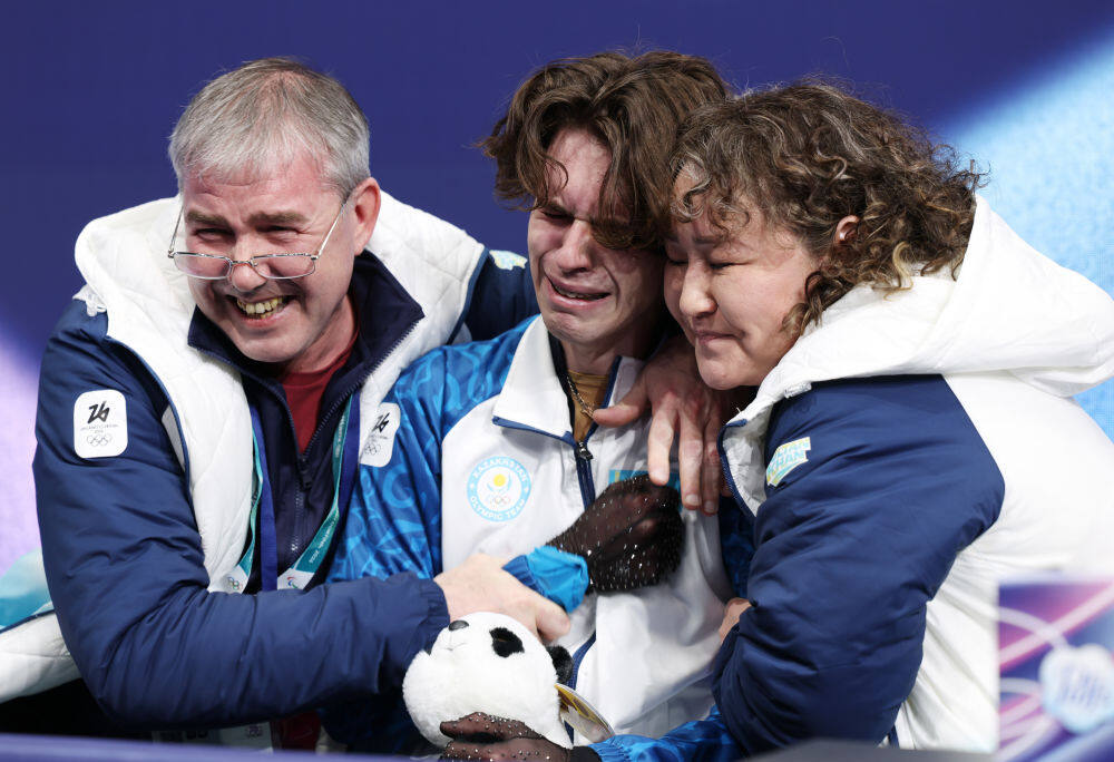 2月13日,哈萨克斯坦选手萨多洛夫(中)在花样滑冰男子单人滑自由滑等分区手持熊猫玩偶。新华社记者 李明 摄
