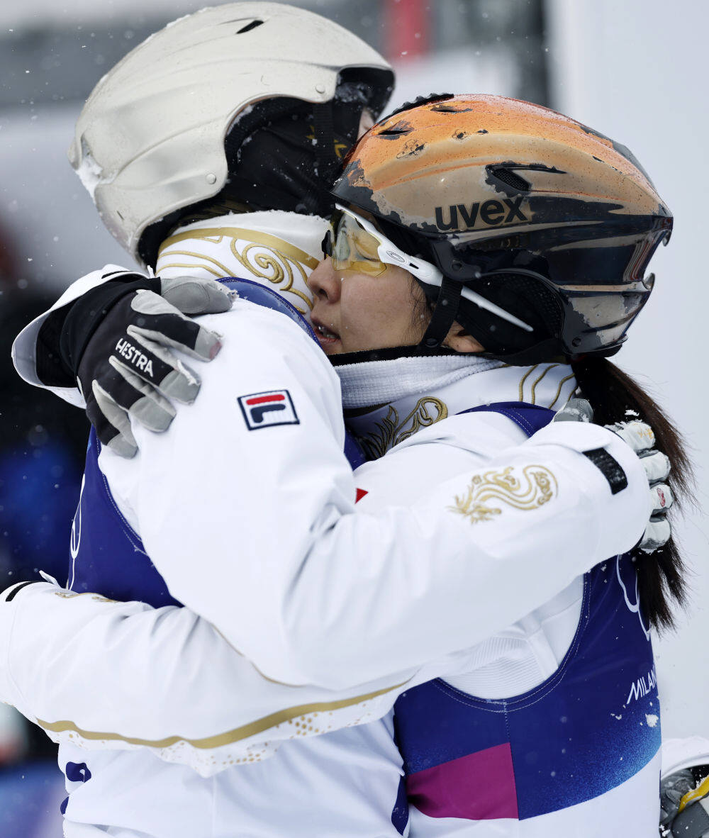 2月21日,中国队选手徐梦桃(右)在自由式滑雪空中技巧混合团体决赛第二轮比赛中安慰王心迪。新华社记者 王鹏 摄