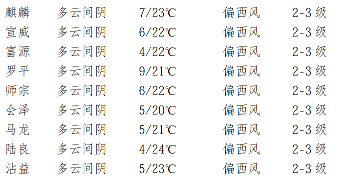 宣威、富源、罗平、沾益东部、师宗东部森林火险气象等级3级(较高),会泽、沾益中部及西部、马龙、陆良、麒麟(含经开区)、师宗中部及西部森林火险气象等级2级(高)。