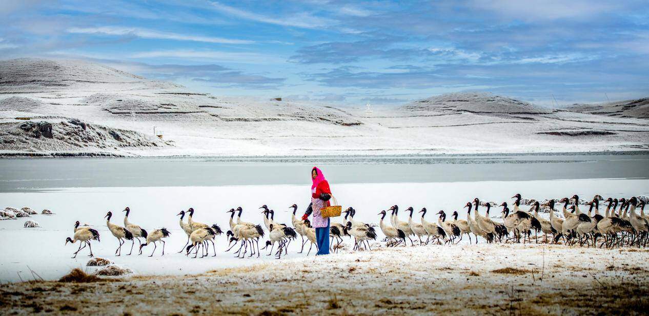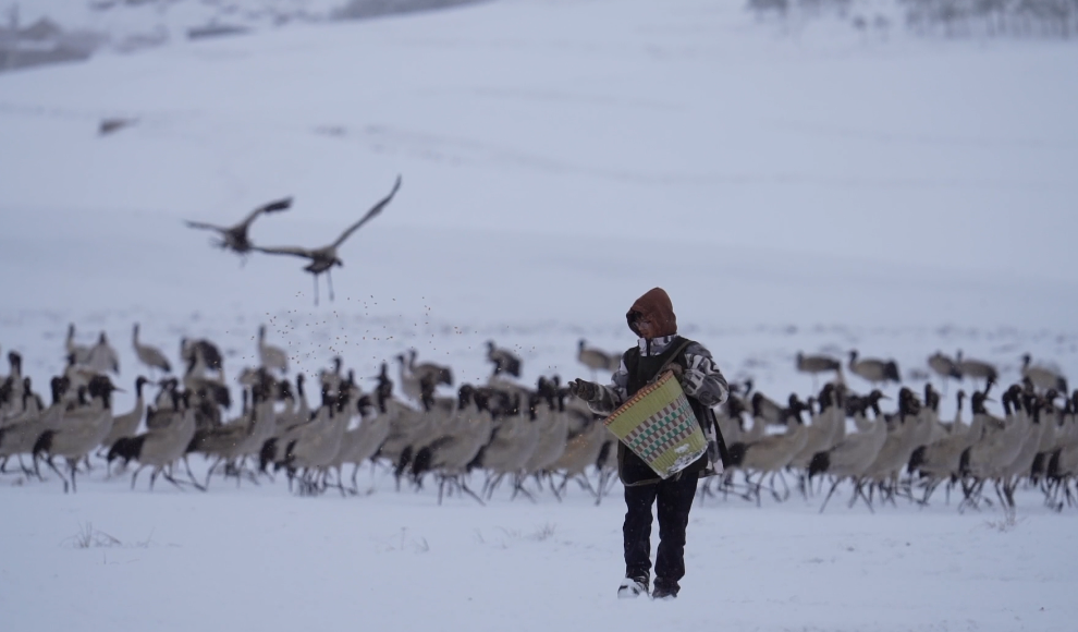 “黑颈鹤机警,怕人。刚开始补充食物时,它们只敢远远看着。”如何取得这些精灵的信任?她尝试过各种办法,日复一日,哨声建立起了人与鹤之间无需言语的默契。如今,陈光惠年轻的儿子也加入了护鹤队伍,从婆婆、母亲到儿子,一场跨越三十余年的守护接力仍在继续。