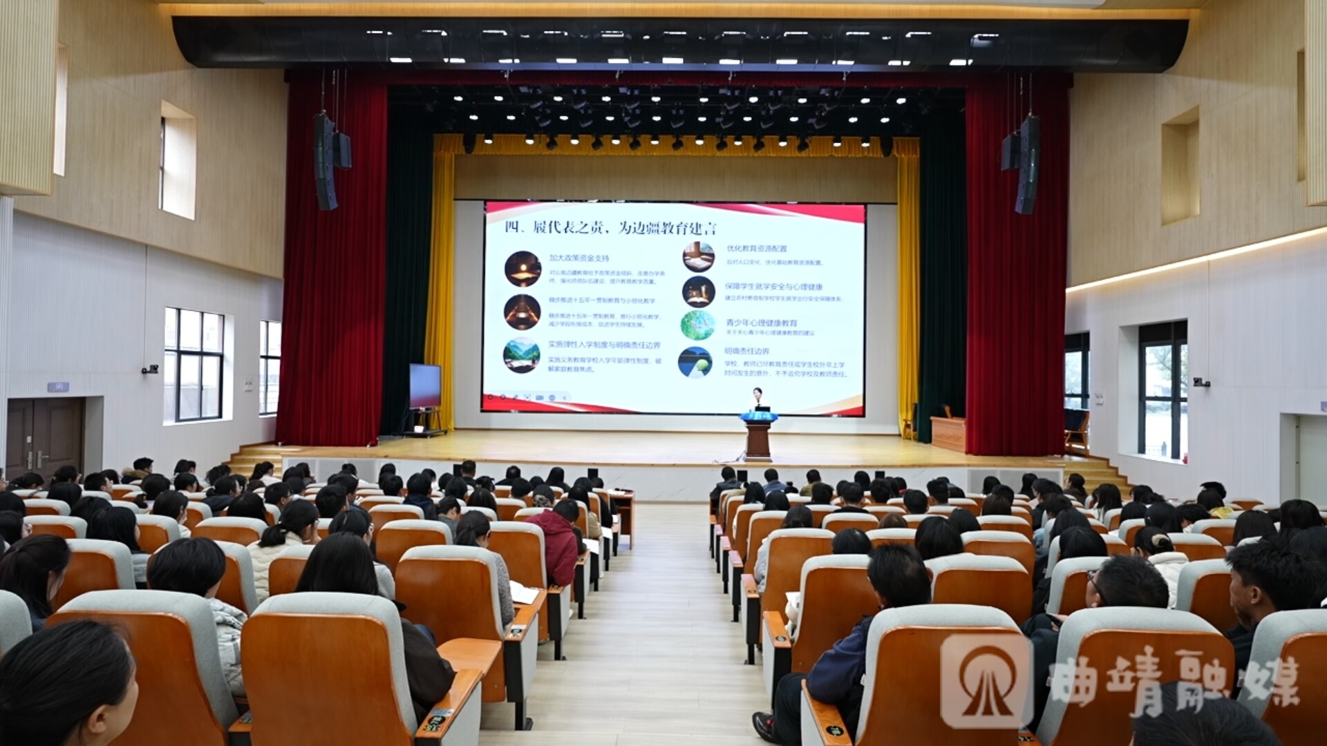 宣讲中,李青霖结合35载从教经历与四次全国人代会履职感悟,围绕“悟两会精神、感教育民生”“明教育家精神、锚定前行方向”“践育人初心、深耕基层实践”“履代表之责、助力边疆教育”四大维度,为师生带来兼具深度与温度的理论宣讲。她重点传达习近平总书记关于一体推进教育科技人才发展的重要讲话精神,解读“十五五”时期教育高质量发展、共同富裕等核心战略任务,结合云南“守望云心”学生心理健康大课堂与学校“健康学校”建设实践,生动诠释教育回归本真、促进学生全面发展的深刻内涵。