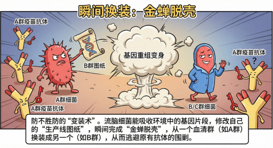 流脑细菌非常聪明,它不仅会自我进化,还会偷偷学习其他细菌的“穿搭指南”。它能修改自己的“工厂图纸”,在短时间内把外套从“A款”换成“C款”。这种“分子级别的换装”让它能反复躲避抗体的围剿。